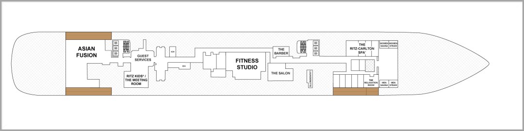 低层甲板3-5层和最高甲板10层分布着游艇的大部分公共设施:五家餐厅、六家酒吧、一个酒窖、一个雪茄室、无边际泳池及池畔酒吧、日光浴区域、丽思卡尔顿水疗中心、丽思孩童项目、精品商店和健身房等等。