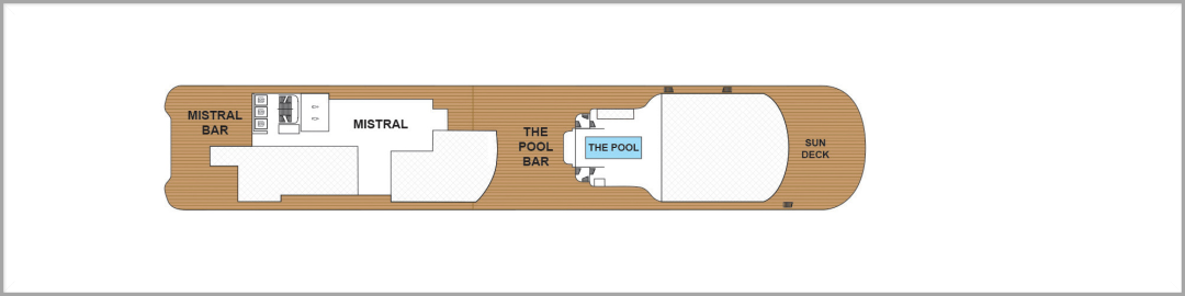 甲板最高层第10层,分布着地中海餐厅和酒吧 Mistral,主泳池以及池畔酒吧,还有仿佛躺在 “世界之巅” 晒太阳般的顶层日光浴甲板!