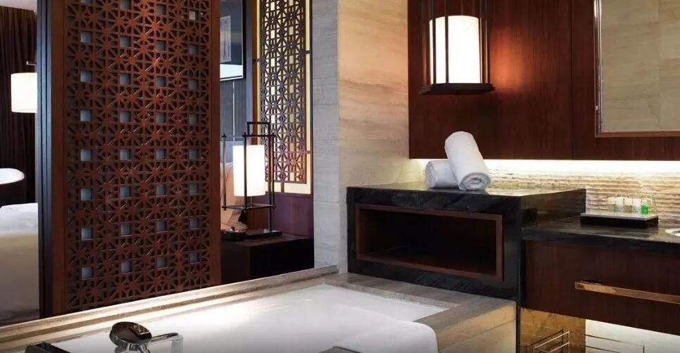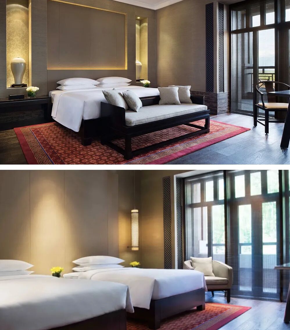55平米起跳的客房是整个度假区里面积最宽敞的客房。房间内遍布东方风格的家具,既让整个空间显得沉稳又带有些原始之美。