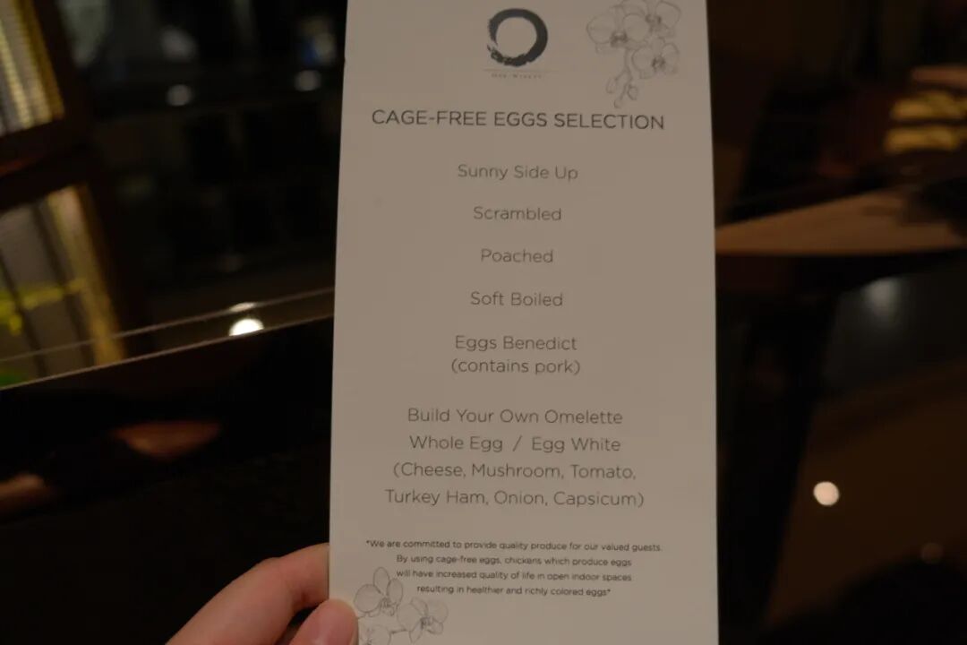 位于一楼的全日餐厅,早餐可在此享用。带领入座后,会先上一份鸡蛋菜单,你可以选择喜欢的鸡蛋烹饪方式。