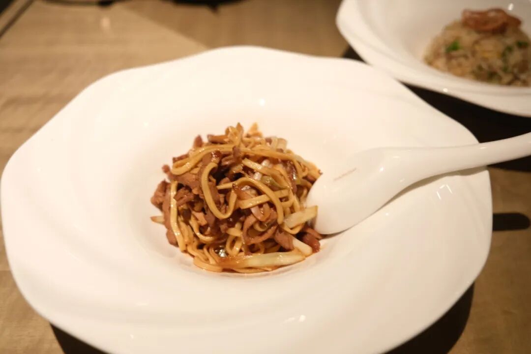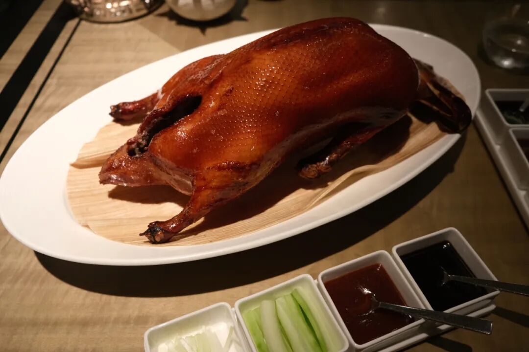 我首先推荐的是他们家的招牌菜——木烤北京烤鸭。有专门的烤炉,烤好后厨师到你面前现场片皮。金黄酥脆的外皮,搭配上鲜嫩多汁的鸭肉,再配上特制的甜面酱和葱丝,卷在薄饼里,一口咬下去,满口生香,剩下的鸭肉还能做炒面与炒饭。