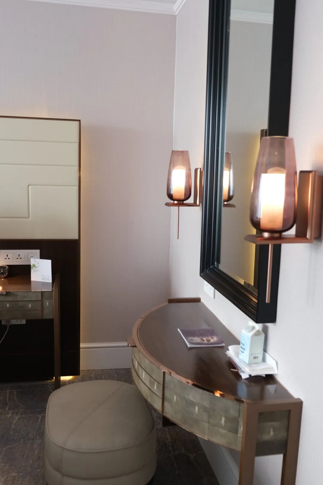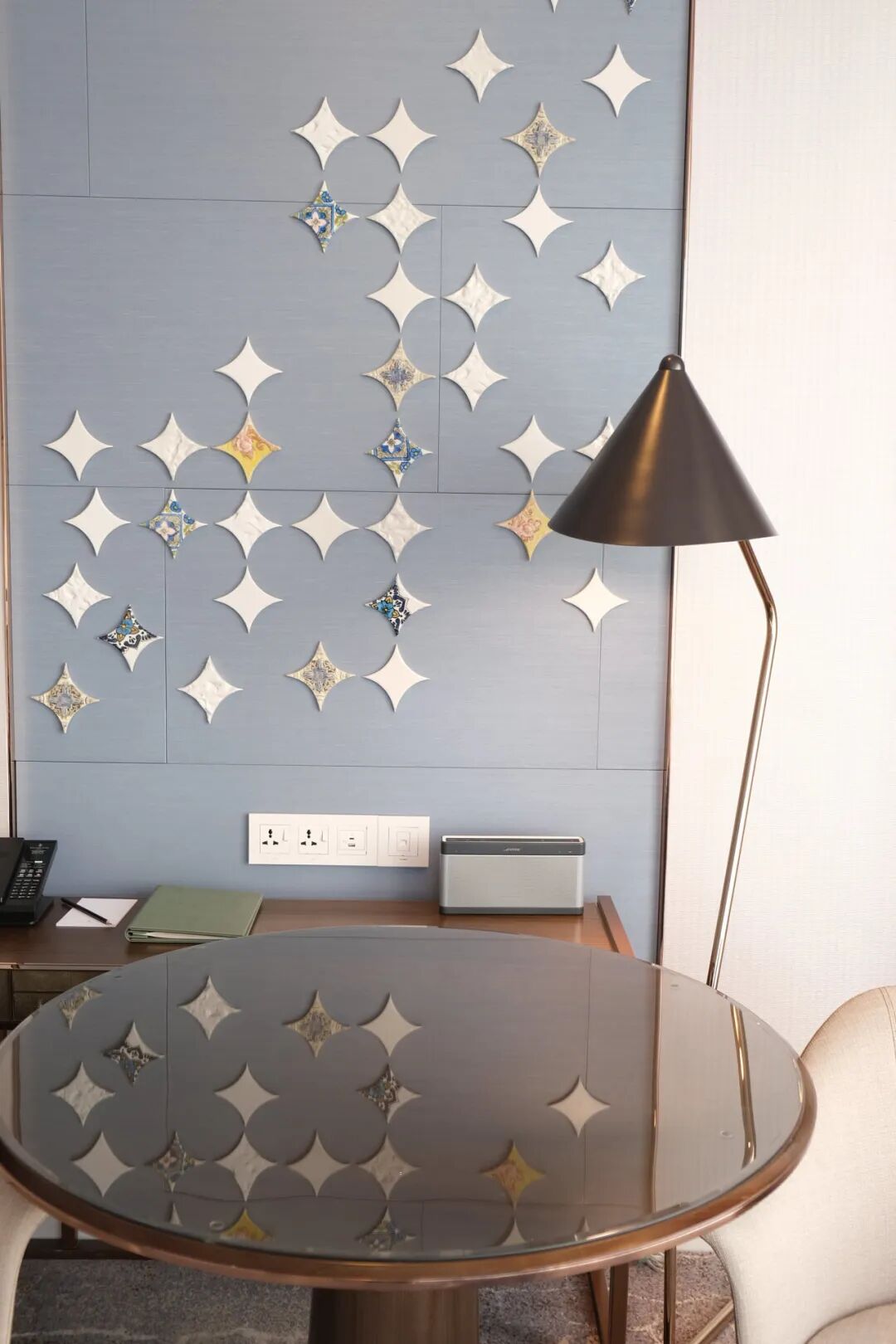 客房从新加坡植物园天鹅湖和莲叶中汲取灵感的画作,所以常出现灰蓝和石灰绿的色调,书桌后还有娘惹文化的瓷砖壁画。还有为女性考虑的坐式梳妆台深得我心。