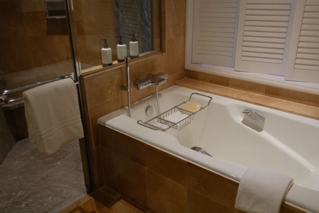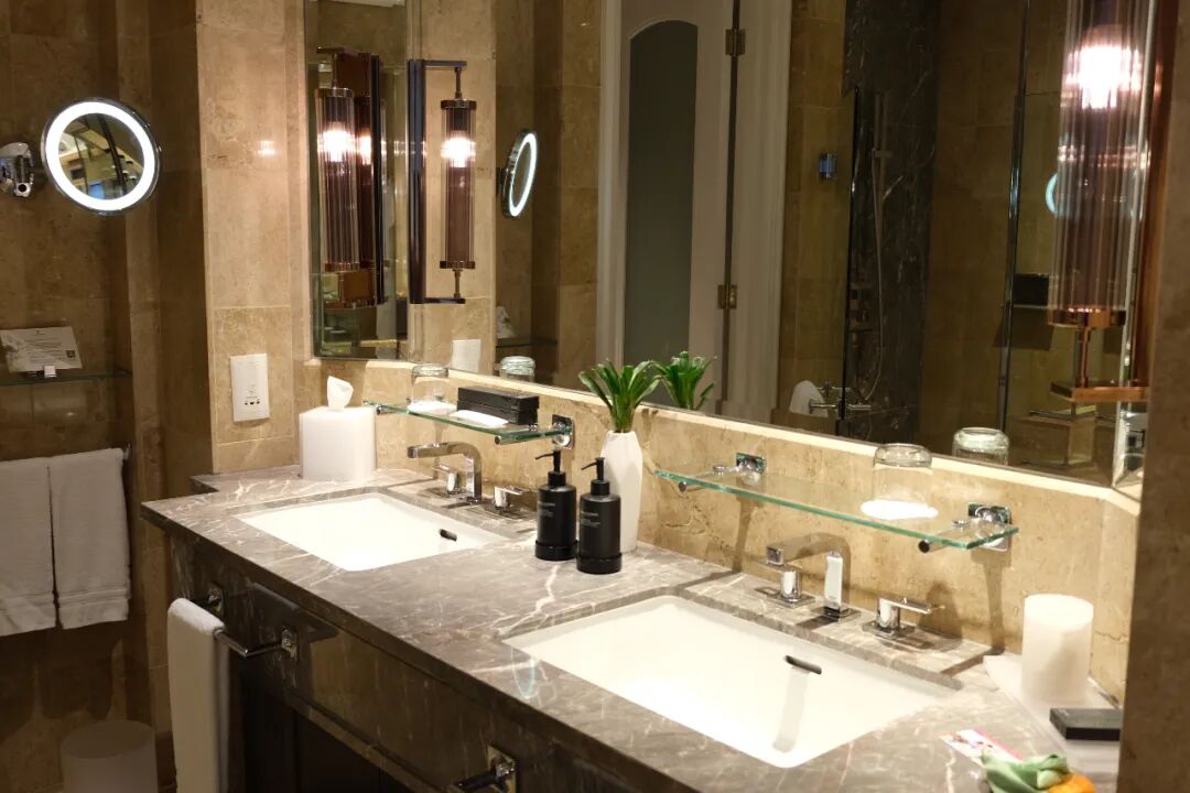 右手边就是盥洗区,白色双开门后是铺有双色瓷砖的大理石浴室,双洗手台设计,洗手台旁边还有个秘密按钮,旋转一下就能在浴室听到电视机播放的声音。配备白色浴缸,可能是环保考虑,洗漱用品都是大瓶装。