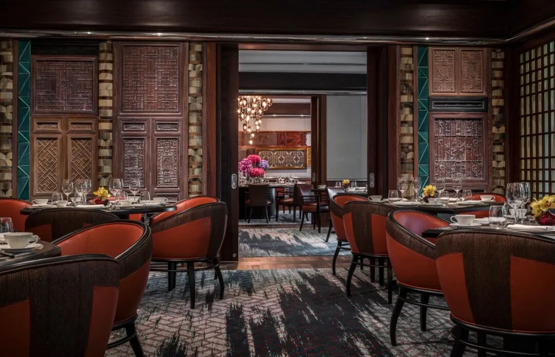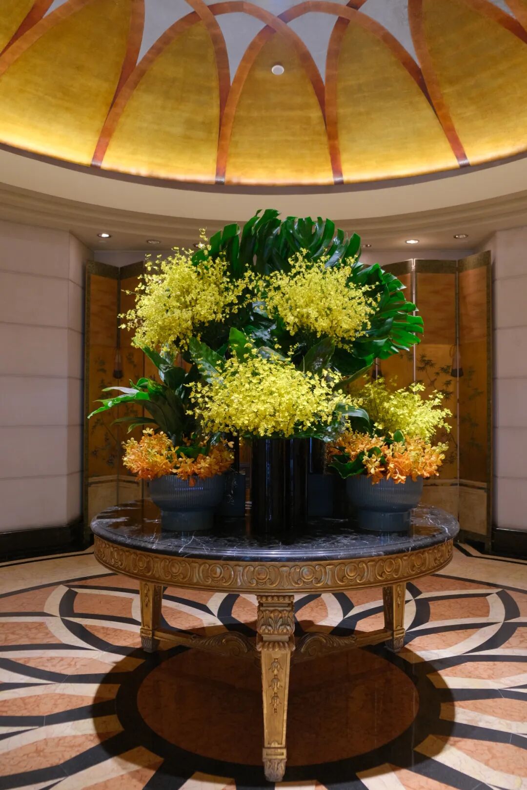 乍一看,大堂充满了旧世界的优雅:精心挑选的瓷砖、错综复杂的地面图案、金色的圆桌,背后传统中式屏风,都在圆顶天花板下的花卉装饰中得到了映衬。四季的大堂总是不缺花卉,从2019年4月起,在花艺大师Nicolai Bergmann的巧手点缀下,酒店大堂的每一束鲜花都充满生机。