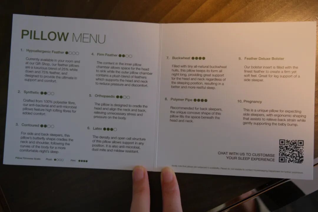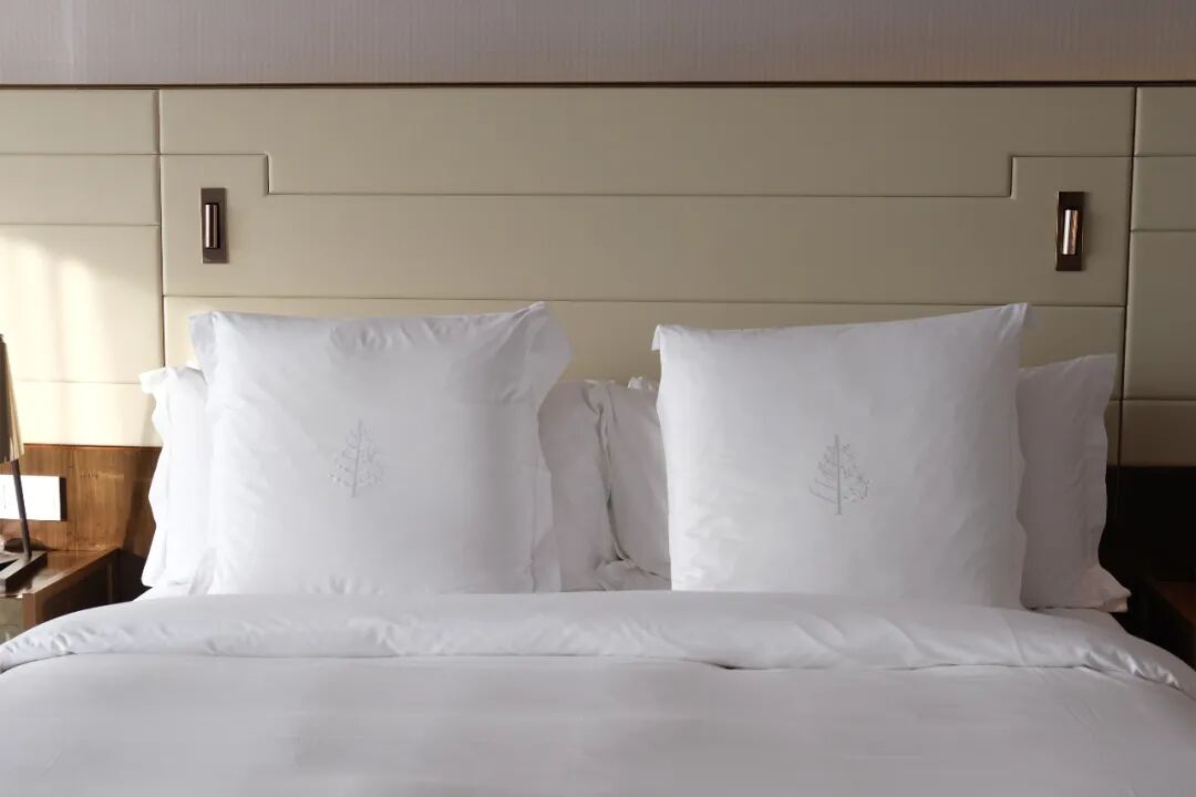 卧室的枕头绣有四季的树叶标志,这里的枕头菜单有多达10种可替换(少见这么多种),不仅有防失眠的,竟然还有防过敏的,孕妇专用的。四季的床比较高,也非常舒适,对睡眠质量要求高的人,甚至会把四季床垫买回家。