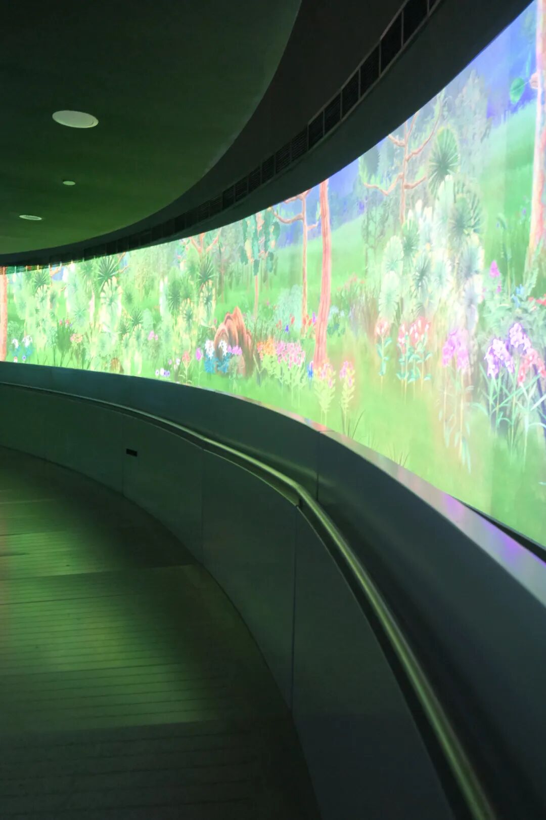 由日本艺术团队teamLab创作的,虽然没有上海的大,但是一进入展馆的圆形全景装置非常有沉浸感,往里走四周和地面都是数字化的自然景观,创造出一种仿佛置身于森林中的错觉。