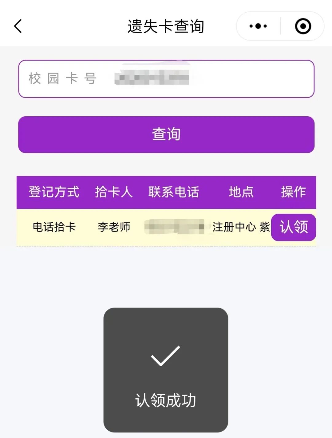 若遗失校园卡被他人拾取并在本系统中登记,即可在查询记录里显示登记方式、拾卡人、联系电话、地点、操作信息。可与拾卡人先行沟通,确认领取地点后再前往领取。