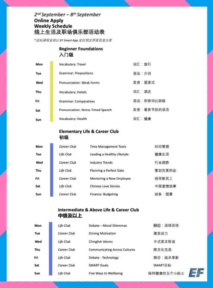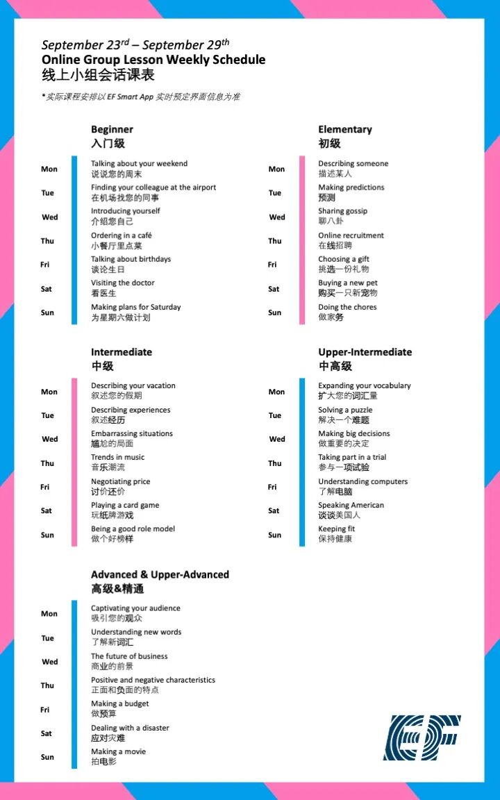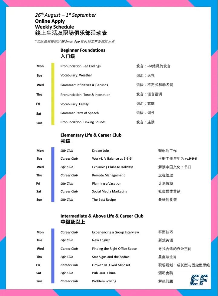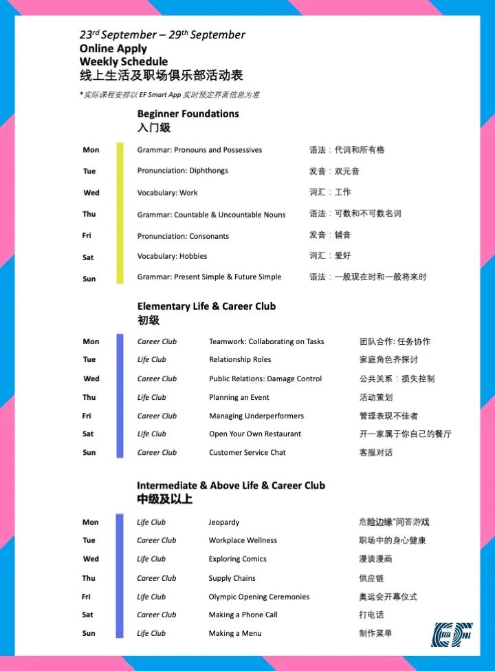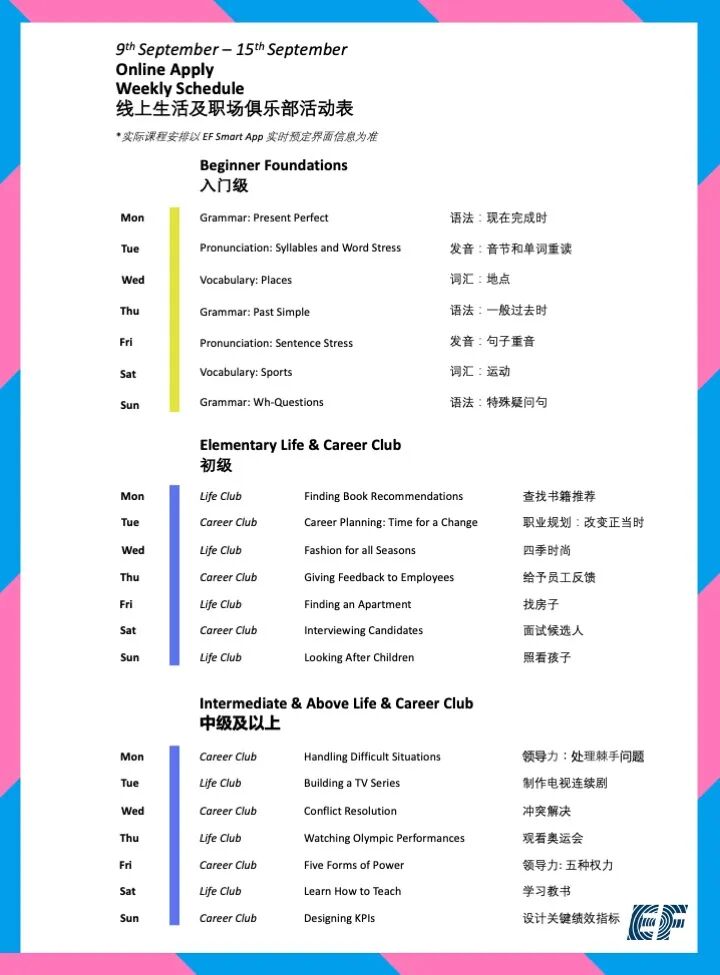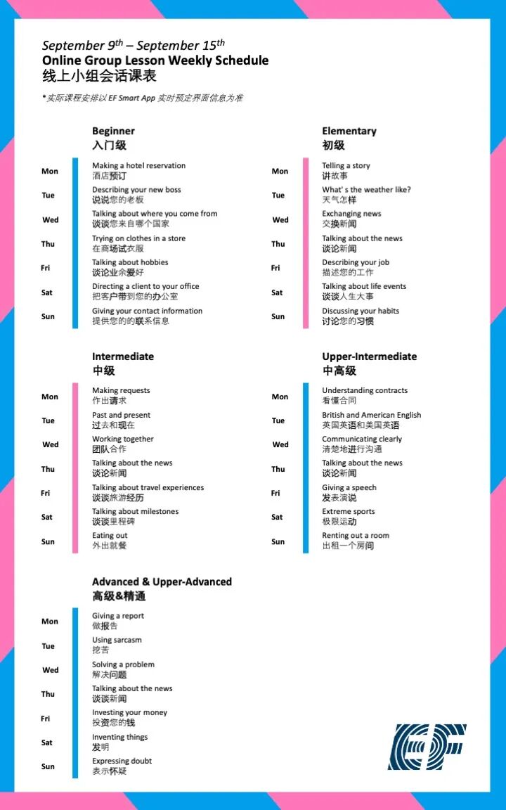 只需在本公众号EF教育集团官方后台回复关键词“课表”即可查询当月线上课程课表