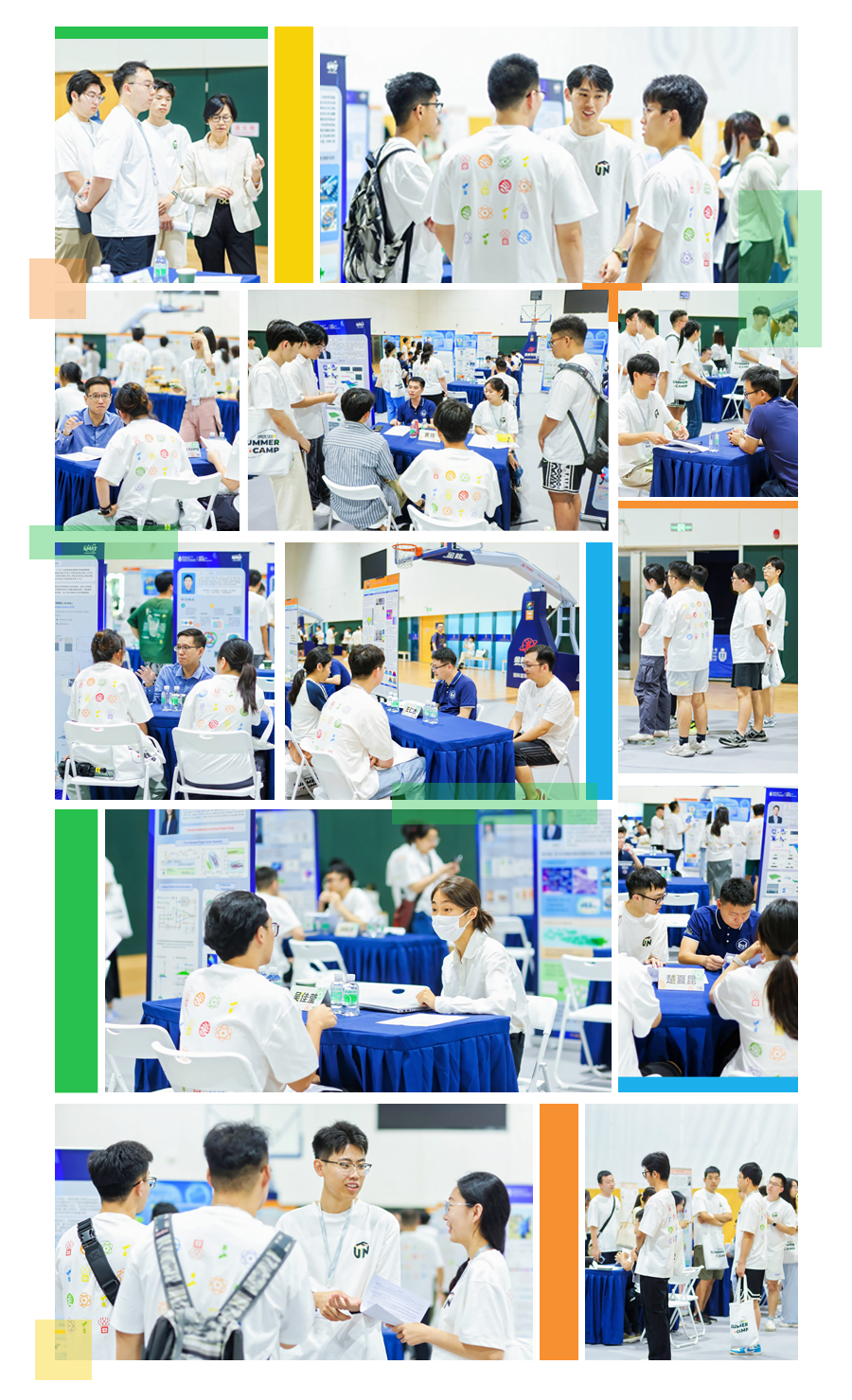 本次师生对话环节涵盖规模超200人,布置教师展位近60个,功能枢纽教师统一着装到场,在自己的介绍海报旁坐下,和营员开始了近三个小时的面对面沟通。很多营员耐心地排队,或是里三层、外三层地包围住了心仪导师。这一环节现场气氛热烈,就自己关心的问题,营员们积极与导师互动。