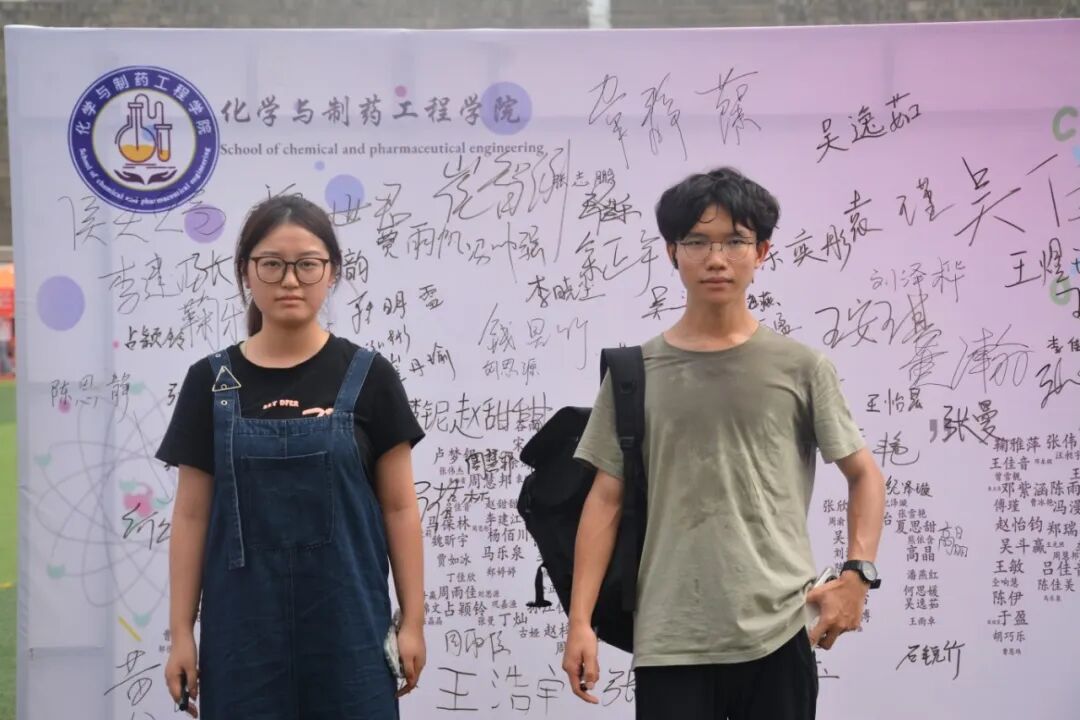 与校园标志性景观墙合影