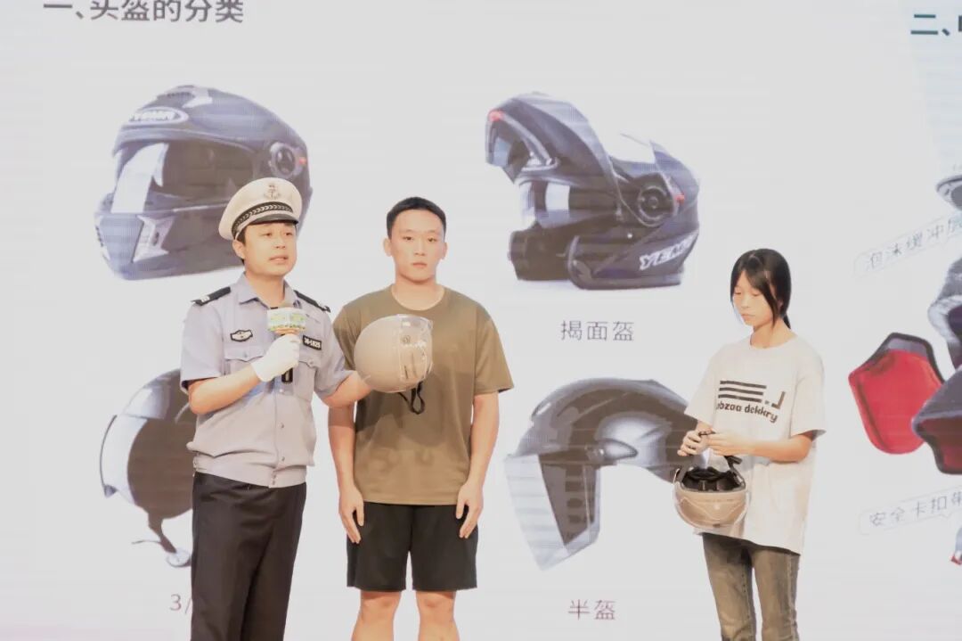 东莞市公安局交通警察支队尹铭坚警官通过现场授课、互动体验、播放警示片等方式,向同学们宣讲安全头盔的3C认购、正确佩戴、保护作用等方面知识,并邀请学生上台体验,宣讲引导同学们如何调整头盔的松紧度、确保头盔佩戴稳固等注意事项。