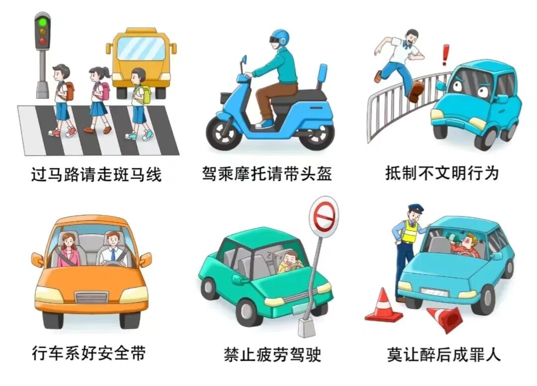 自觉遵守交通规则,出行时不闯红灯、不翻越围栏、不猛跑急停,不在车前车后逗留奔跑,驾驶机动车或骑乘自行车要文明行驶(电动自行车切记要佩戴安全头盔),外出乘坐正规合法营运车辆并使用安全带。