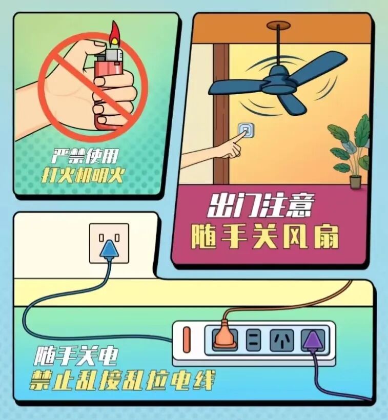 离开宿舍时,要关闭电源;严防电动车火灾,不在公共区域充电,不将电池带回家中充电;外出踏青时,不在林区、草地野炊、烧烤,野炊结束后要彻底熄灭余火,清除干净杂物,避免发生复燃。