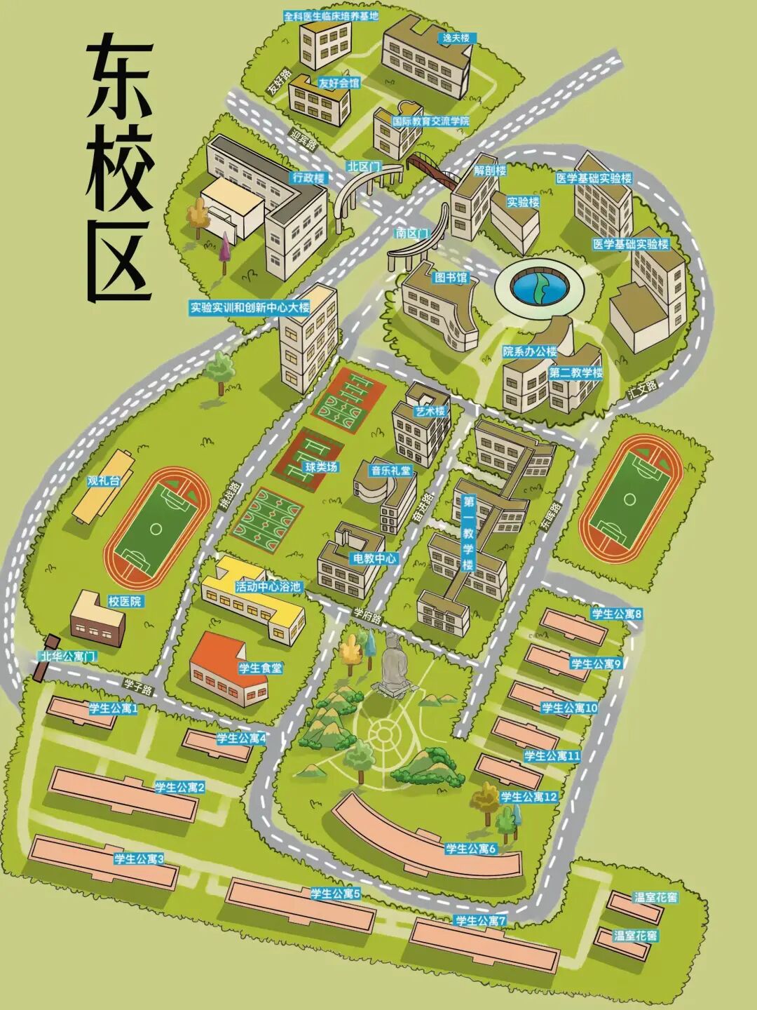 东校区现有外国语学院、美术学院、音乐学院、理学院、材料科学与工程学院、土木与交通学院、林学院、基础医学院、公共卫生学院、临床医学院、医学技术学院、口腔医学院、护理学院、药学院、经济管理学院、国际教育交流学院及理学院。同学们出入校园的主要出口有三个:便捷出口(公寓五号楼旁,暂时关闭)、生活出口(临近校医院,对面是综合商场)、主校门出口(临近图书馆)以及通过北华桥即可到达的行政区出口(主校门对面)。