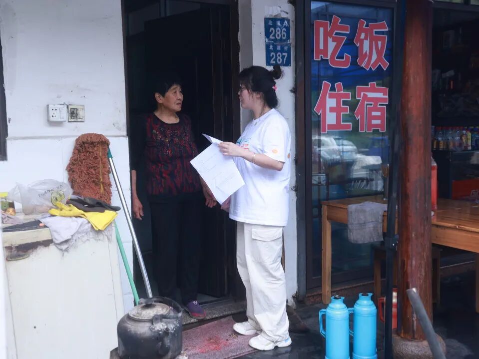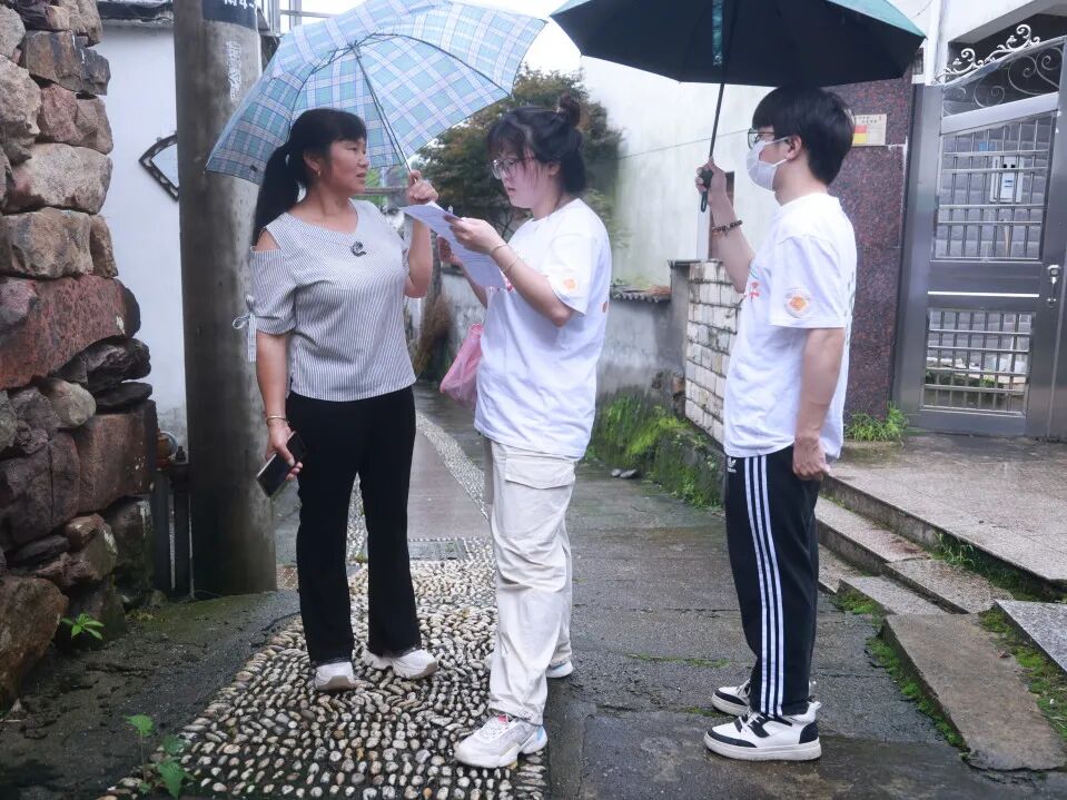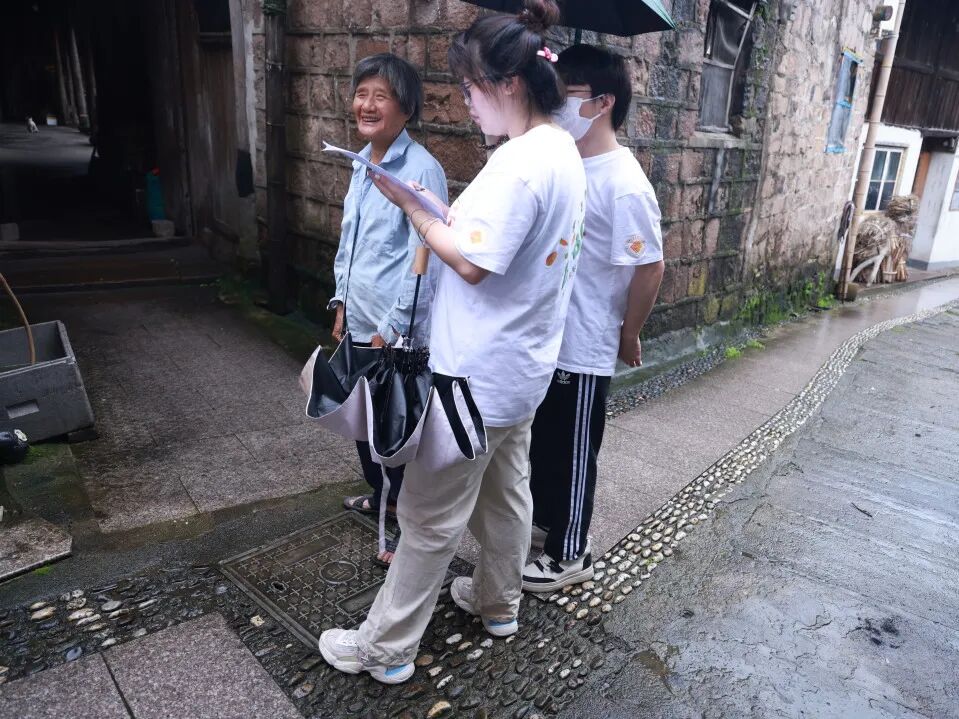 北溪村的村道蜿蜒伸展,泥土的清香在空气中弥漫,青砖黛瓦的古朴房屋在雨中更显得的味悠长。实践队员来到了走访之旅的第一站——北溪村村委会。北溪村社保协理员杨芳芳告诉队员们积善指数的内涵和实施情况及其对经济发展的影响,这一考核制度覆盖全村,将村民的卫生习惯与年终分红直接挂钩,以此激励大家增强环保意识培养良好的卫生习惯。积善指数不仅是一项促进村庄环境整洁的措施,也是推动“千万工程”政策和筑牢共同富裕根基的一部分。