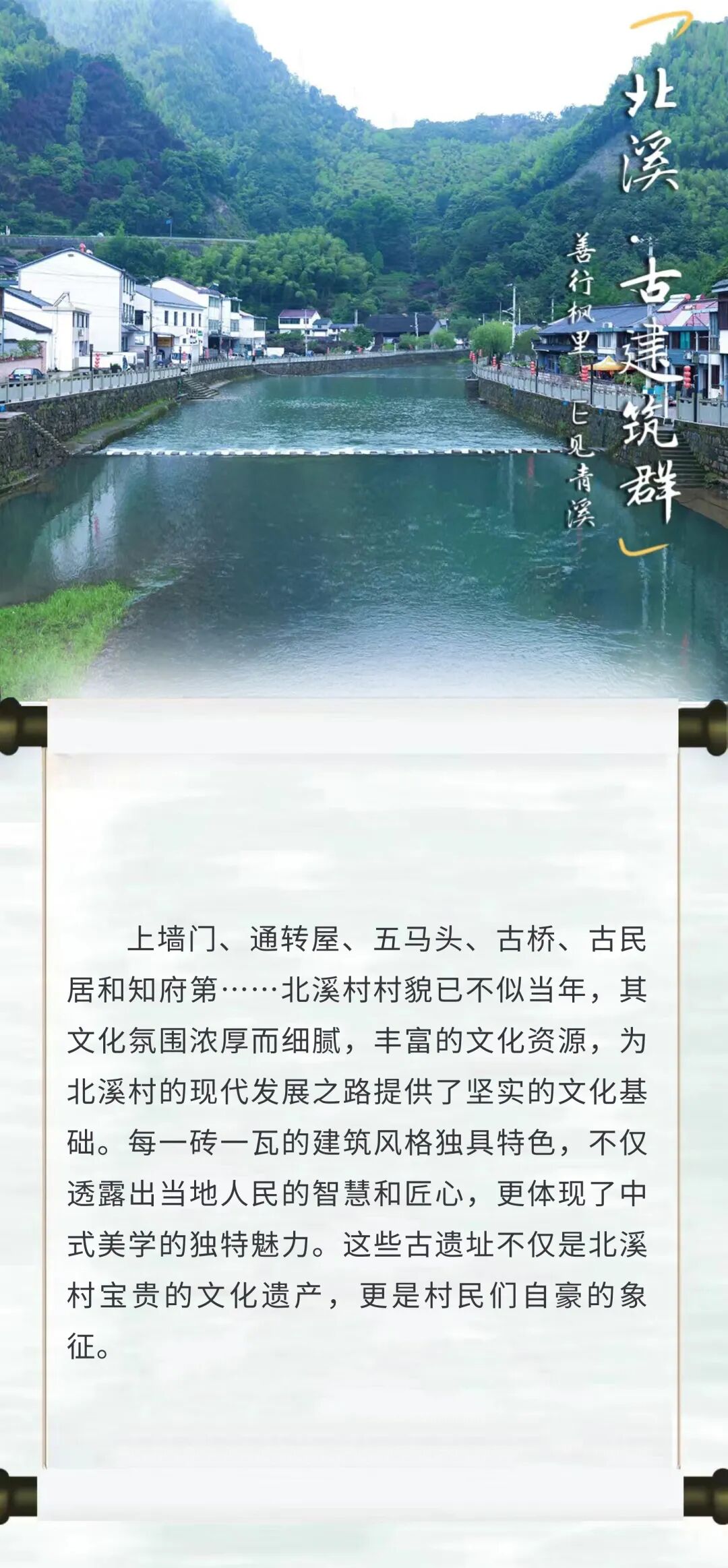 上墙门、通转屋、五马头、古桥、古民居和知府第……北溪村村貌已不似当年,但其文化氛围浓厚而细腻,丰富的文化资源,为北溪村的现代发展之路提供了坚实的文化基础。其中,每一砖一瓦的建筑风格独具特色,不仅透露出当地人民的智慧和匠心,更体现了中式美学的独特魅力。这些古遗址不仅是北溪村宝贵的文化遗产,更是村民们自豪的象征。更加坚定了青年一代的文化自信,为文化强国之路夯实基础。也正是这样的一种精神力量,不断启迪着北溪村发挥文化资源优势,打造独具特色的文化产品和旅游项目,照亮北溪村进一步发展的前行之路。