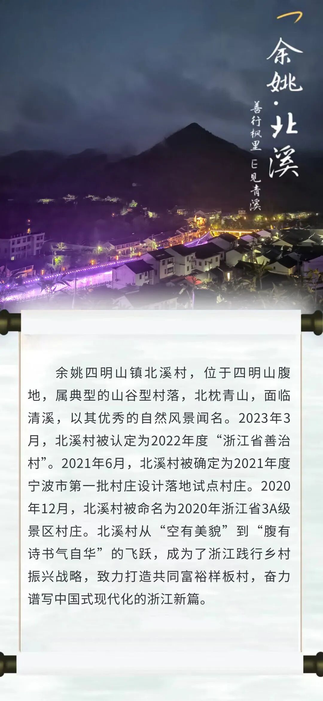 巍巍巨轮,行稳致远。为全面贯彻学习习近平总书记在浙江考察时的重要讲话精神,深刻领会“千村示范,万村整治”工程,服务乡村振兴战略,让青年学子们在社会实践中受教育、长才干、做贡献。6月下旬,浙江商业职业技术学院电子商务学院辅导员章璇子、路璐带领“善行枫里,E见青溪”暑期社会实践队前往余姚市四明山镇北溪村,探寻北溪村从落后的经济薄弱村到成为当地“以农促旅、以旅兴农“的共同富裕示范村的成功经验,以青年视角向大众讲述浙江省的共富故事,也为挖掘当地特色带动经济发展,助力乡村振兴实现共同富裕贡献青年智慧与力量。