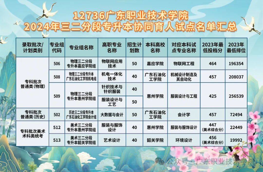 根据广东省教育厅《关于开展2024年高职院校和本科高校协同育人试点工作的通知》文件,我校获批与惠州学院、嘉应学院、广东石油化工学院、韶关学院等4所公办本科高校开展7个专业点合计310招生计划三二分段专升本协同育人项目。