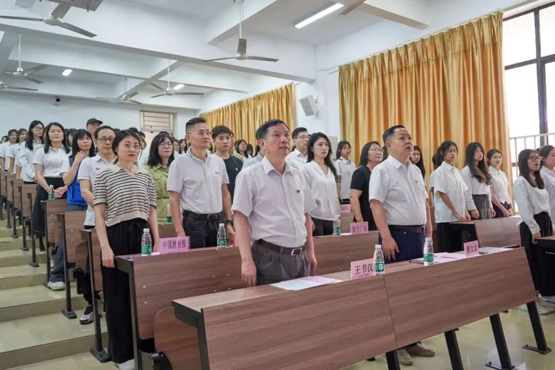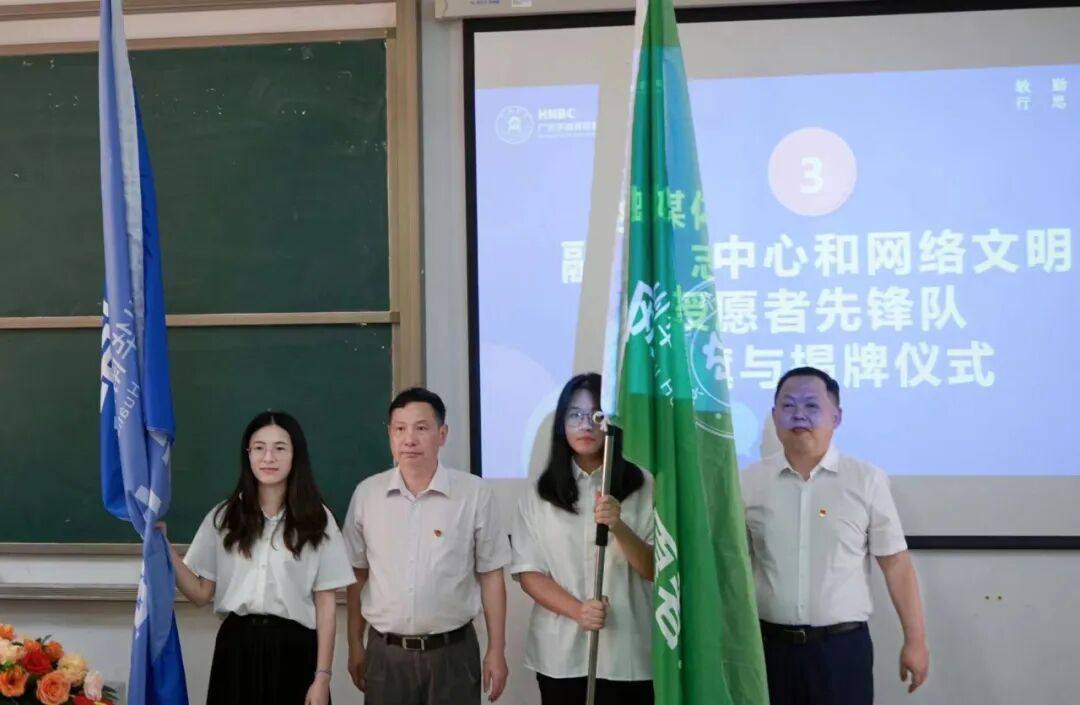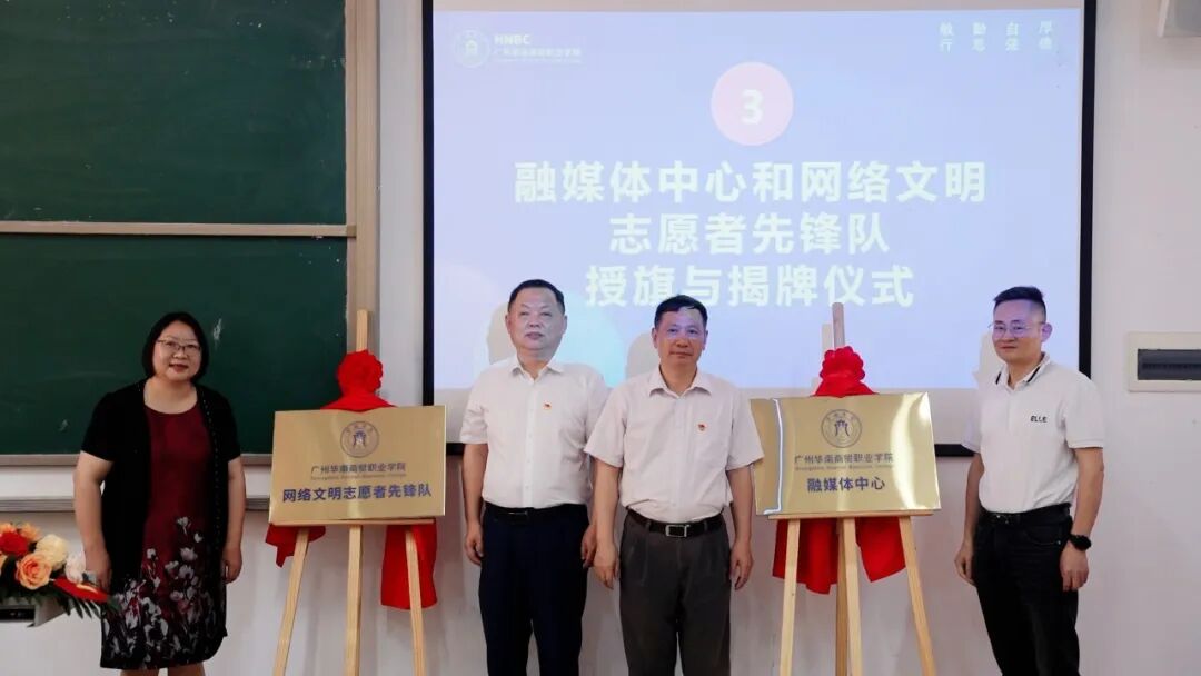 校长曹文文、党委书记王书汉、光明日报广东站站长吴春燕、新华网广东有限公司副总经理傅立新作为揭牌嘉宾,为融媒体中心、网络文明志愿者先锋队揭牌。