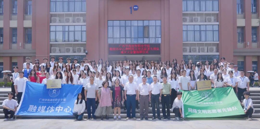 5月15日上午,广州华南商贸职业学院举办融媒体中心和网络文明志愿者先锋队成立大会暨揭牌仪式活动。人民日报社广东分社采编中心主任贺林平、光明日报广东记者站站长吴春燕、新华网广东有限公司副总经理傅立新、数字广东编辑部主任张瑶、中国教育报广东记者站记者蒋颖妍、羊城晚报记者甘卓然、信息时报记者邹甜、新快报记者徐绍娜、广东广播电视台广播融媒中心(新闻广播频率) 副主任黎辉、《广东教育》杂志社主任魏家坚、中华新闻网编辑部主任李苑立、中国教育在线编辑郭健明以及校长曹文文、校党委书记王书汉、各二级学院党组织书记、行政党群部负责人、宣传中心老师以及华贸记者团成员代表和网络文明志愿者先锋队成员代表参加本次活动。