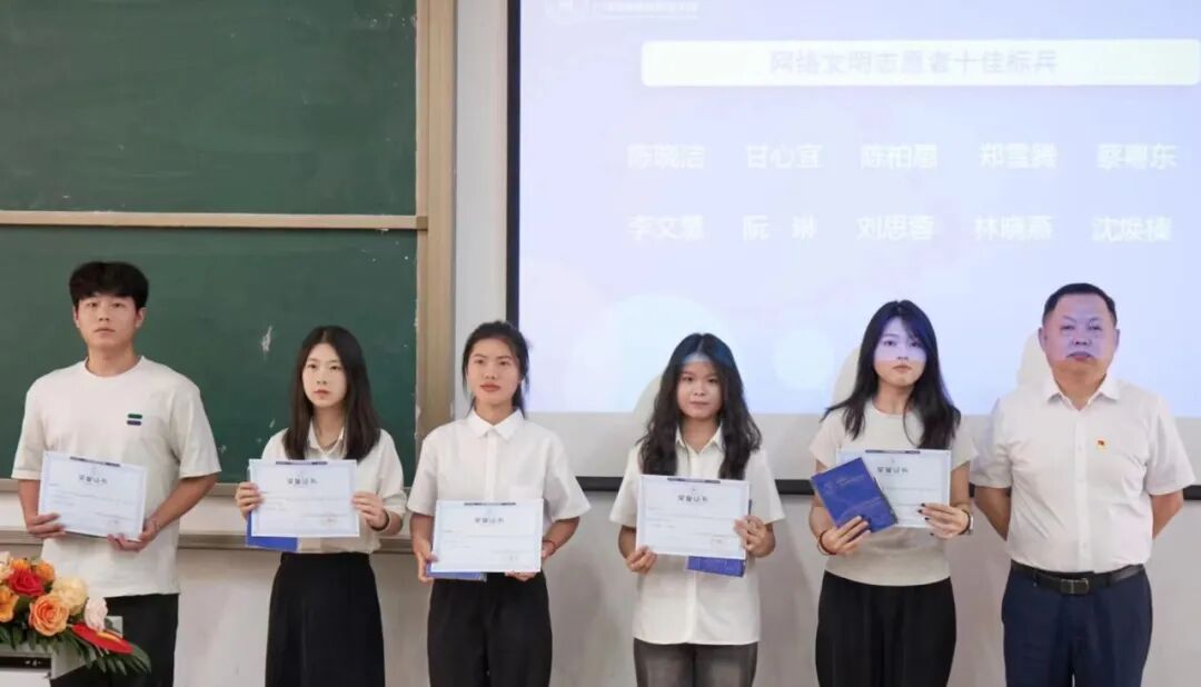 校长曹文文为网络文明志愿者十佳标兵颁发荣誉证书。