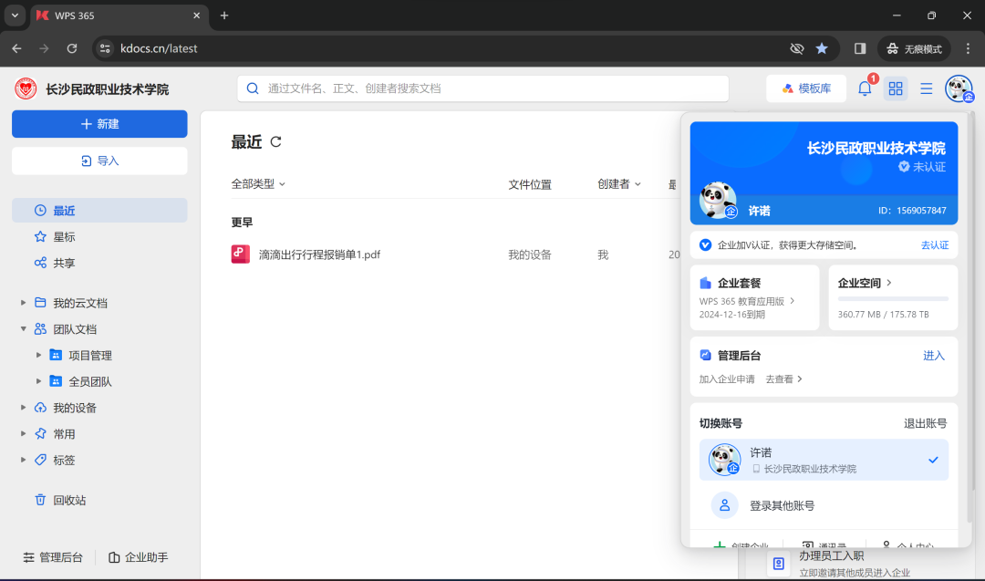或长沙民政职业技术学院WPS 365专用版,使用我校统一身份认证登录。