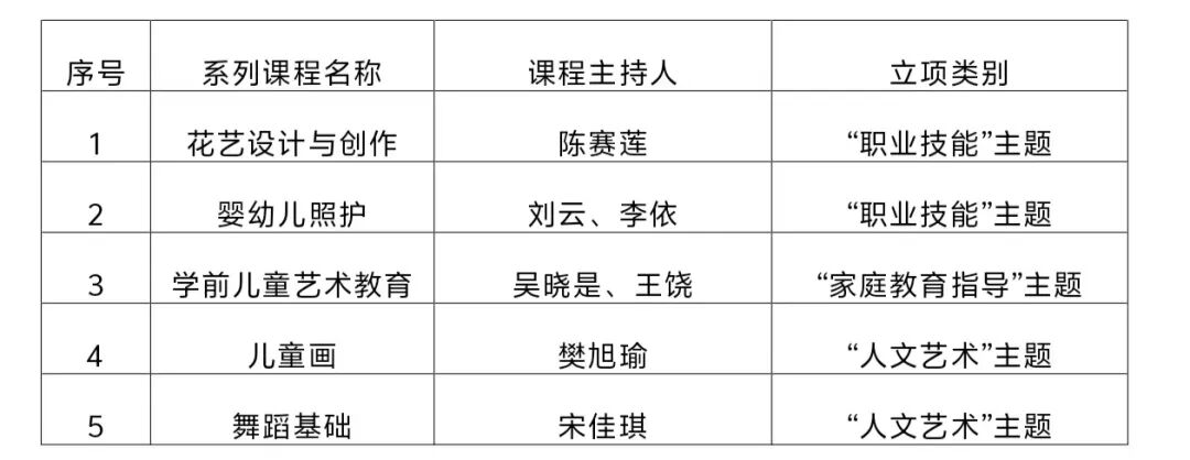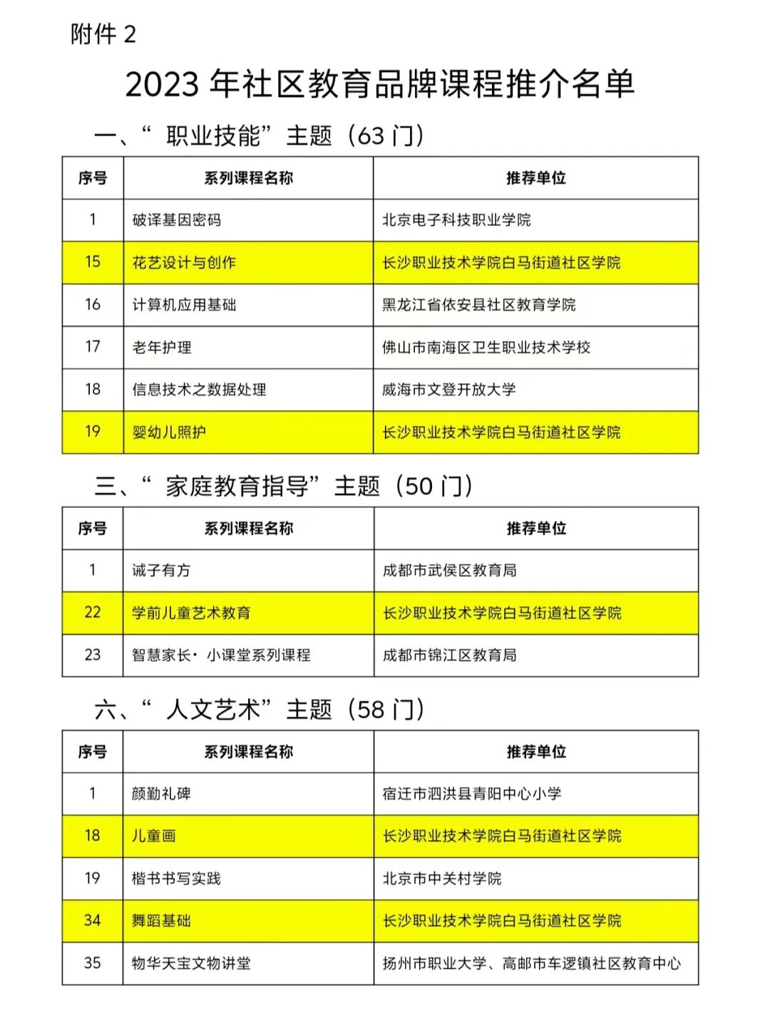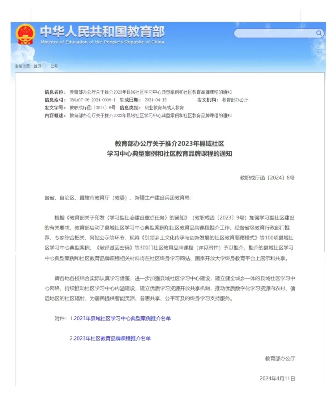 从《教育部办公厅关于推介2023年县域社区学习中心典型案例和社区教育品牌课程的通知》(教职成厅函〔2024〕8号)获悉,全国共立项社区教育品牌课程300门,我校成功立项5门社区教育品牌课程,具体如下:
