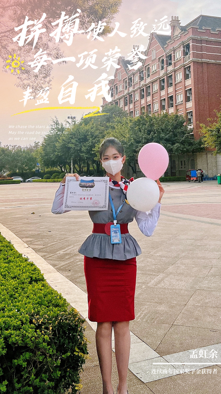 用青春去挥洒激情,用拼搏去创造未来。自入校以来,孟虹余连续两年荣获“国家奖学金”;加入空乘学院现代绅士淑女会,并成功竞选团总支秘书部副部长,做好学生服务,执行面试秩序维护多达上百场,收获了“四川省优秀毕业生”,“四川省大学生综合素质A级证书”、“优秀大学生”,“五四青年奖章”,“优秀学生干部”等荣誉称号;参与新年晚会、五四系列活动等节目表演并获奖……