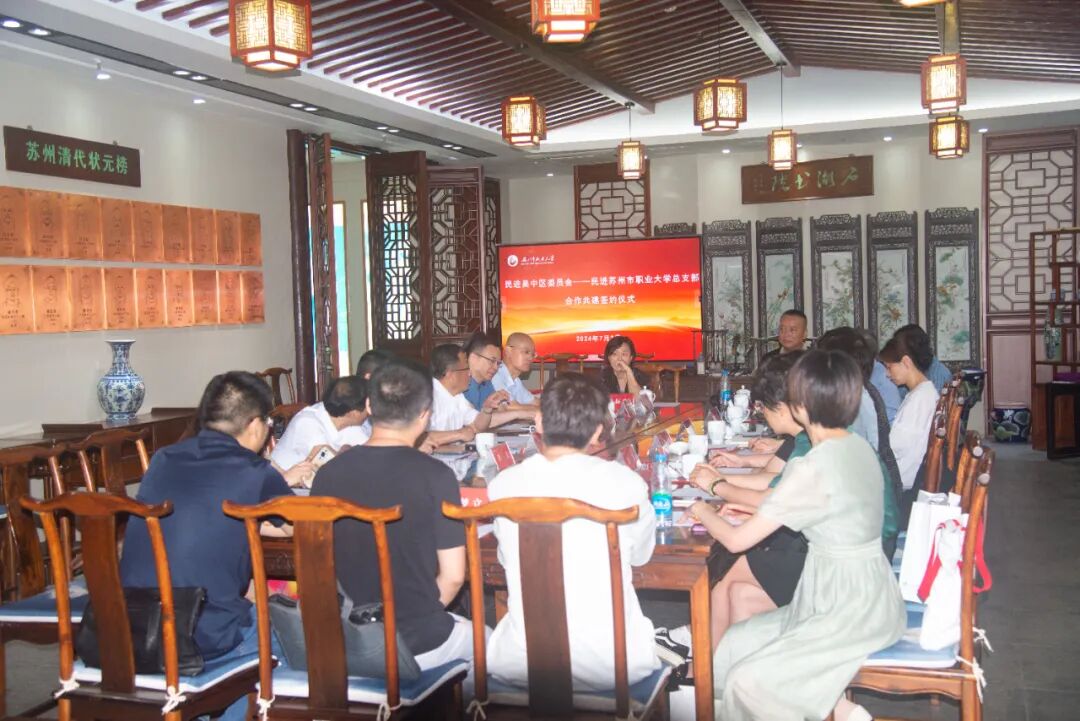 为进一步深化校地合作,共谋服务地方经济社会创新发展新路径,7月3日下午,民进吴中区委员会与民进苏州市职业大学总支部在石湖书院举行合作共建签约仪式。民进市委会专职副主委於亚萍,民进吴中区委会主委、吴中区政协副主席周黎敏,民进市委会组织处长许红,民进吴中区委会副主委庄梅、钱家荣、徐琴华,秘书长王伟忠;校党委书记曹毓民,党委办公室主任汤晓军,宣传统战部副部长蒋君毅、机电工程学院副院长陆春元,民进苏州市职业大学总支主委李文及课题组相关人员等参加会议。会议由蒋君毅主持。