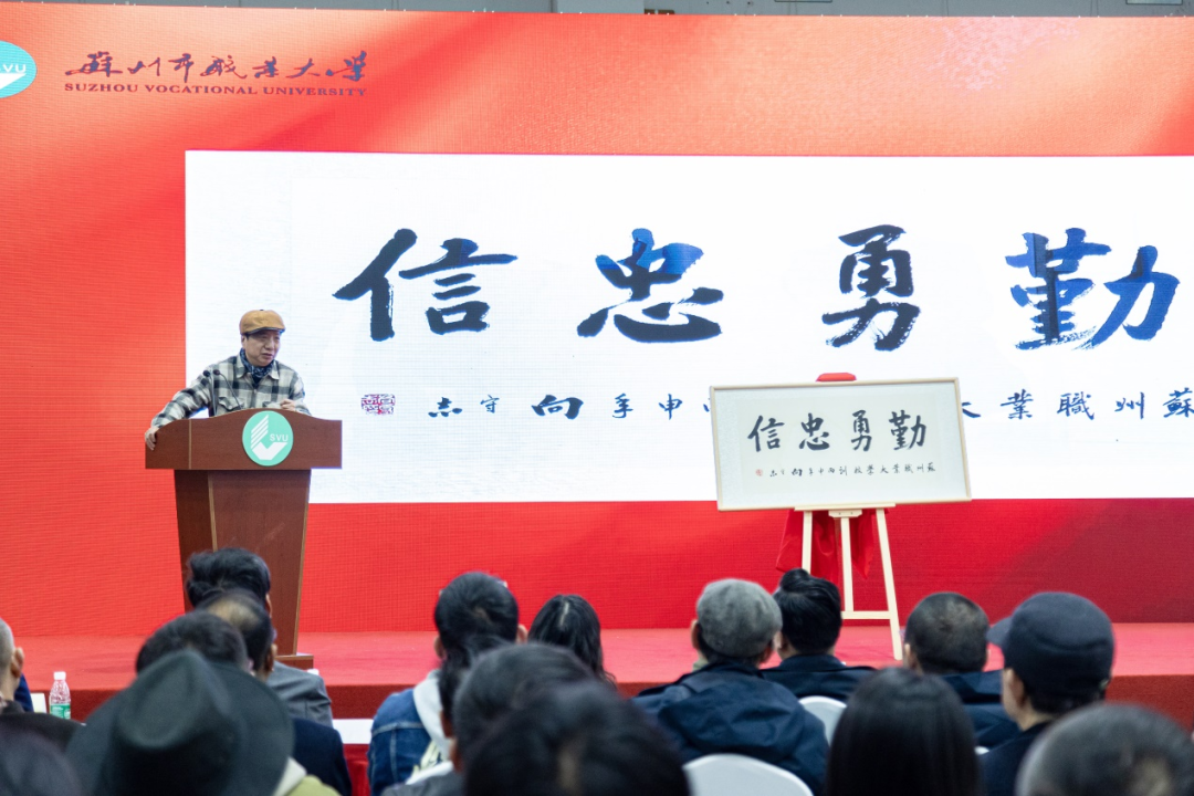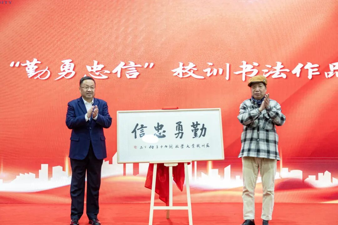 爱心人士张明敏作为捐赠代表,上台捐赠了原南京军区司令员、中华人民共和国上将向守志将军“勤勇忠信”校训书法作品,并分享了向守志将军书写“勤勇忠信”校训背后的故事,以及他对教育事业的支持和情怀。曹毓民代表学校上台接受了捐赠,共同揭开红幕并合影。