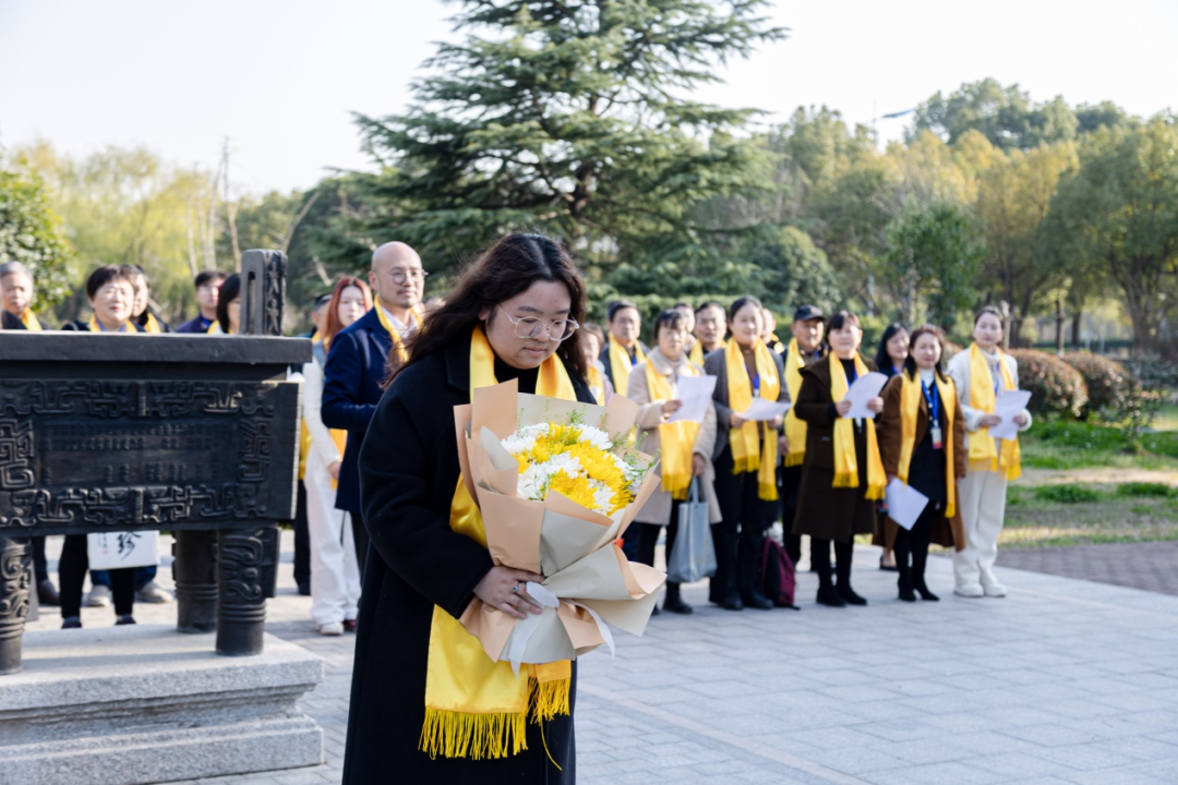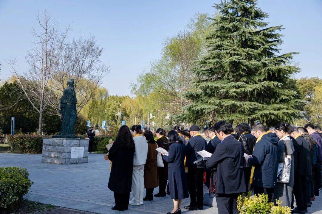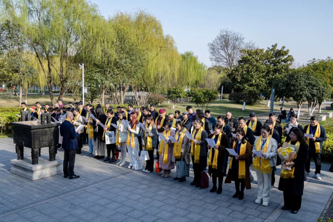 第二阶段,百名书家参观吴文化园、拜谒顾野王。“龙行龘龘”一词便出自南朝梁陈间史学家、小楷书法鼻祖顾野王的《玉篇》;在顾野王园,百名书家围戴黄丝巾,市书法家徐世平的领诵,全体三鞠躬并诵读祭文,夏祖晗作为书法家代表上前进献鲜花,表达对于先贤的追思与敬仰。