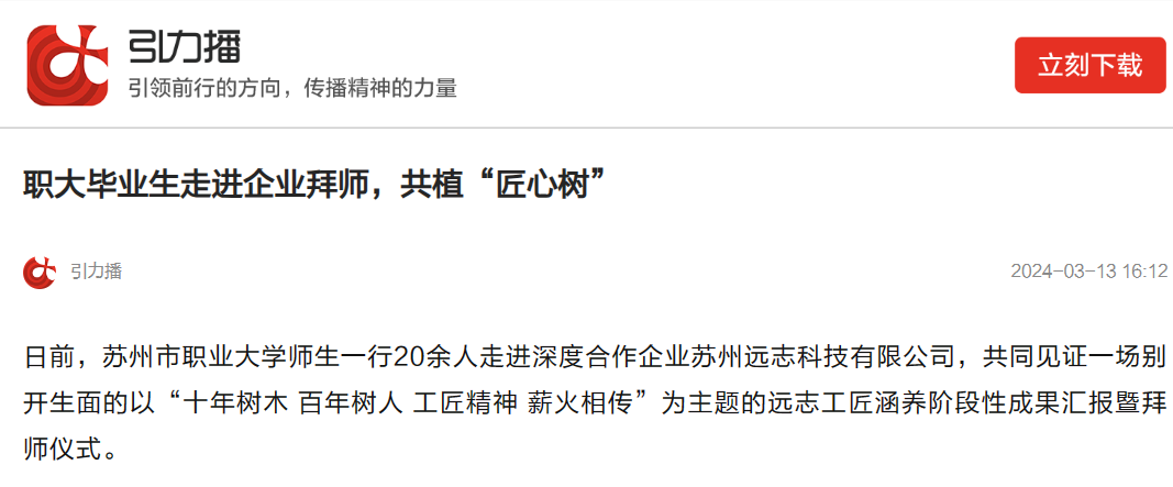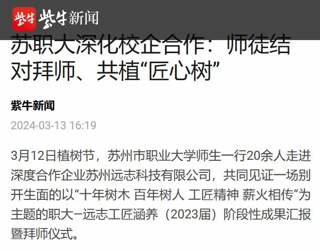 3月12日植树节,我校师生一行20余人走进深度合作企业苏州远志科技有限公司,共同见证一场别开生面的以“十年树木 百年树人 工匠精神 薪火相传”为主题的职大—远志工匠涵养(2023届)阶段性成果汇报暨拜师仪式。