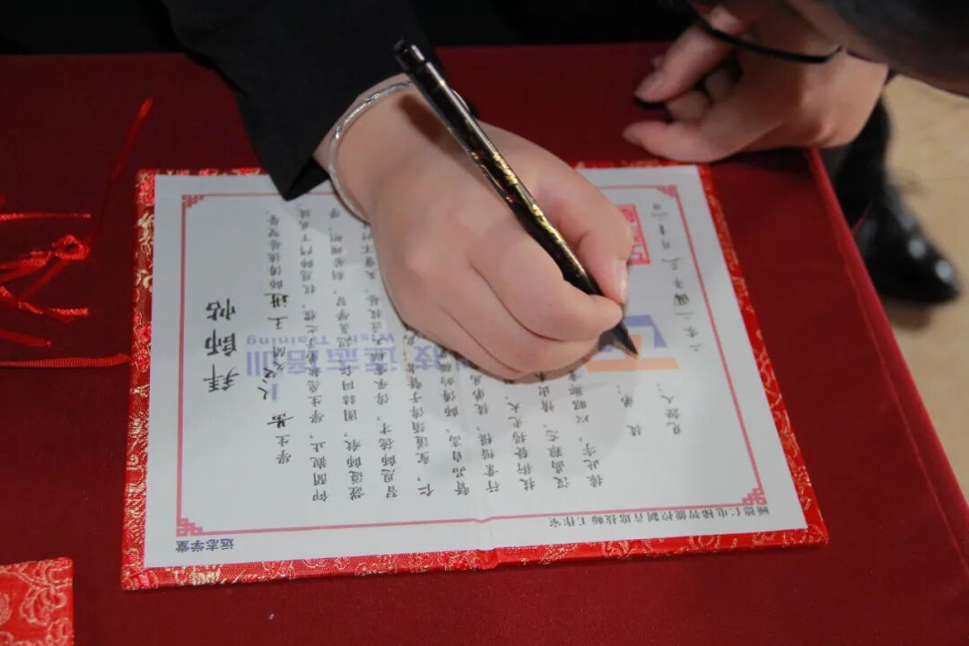 拜师仪式进入敬茶环节,只见徒弟们双手奉上一杯菊花茶,伴随着响亮的“师傅,请喝茶!”徒弟向师傅鞠躬行礼。师傅接过茶,深情寄语:“志存高远,厚积薄发。”徒弟大声回应:“谨遵师傅教诲!”在这样隆重且充满温情的场景下,六对师徒正式确立师徒关系。