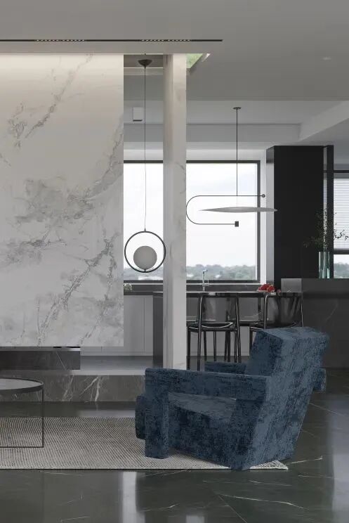 贯穿墙面的水墨纹理,轻柔生动,与地面隐约可见的深灰色亮石纹遥相呼应,削弱空间的沉闷感。暗蓝色的家具、淡蓝色的摆件与空间相辅相成,用色彩营造出清凉的居家空间。