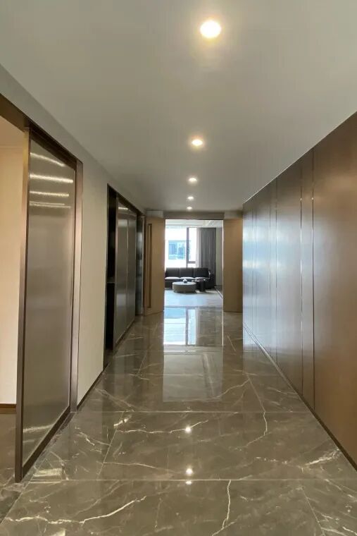 公共区域的墙面应用了巍象系列木纹产品,原木的暖性质调,含蓄而又温润,巧妙地中和了地面石纹的凛冽感。