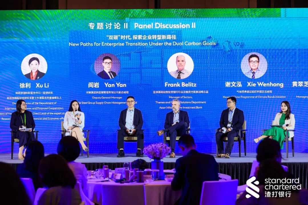 而在第二场主题为“双碳时代,探索企业转型新路径”的专题讨论环节中,财政部国际财金合作司一级调研员、财政部国际财经研究专家工作室国合司直接牵头人徐利,河钢集团供应链管理有限公司副总经理阎岩,亚洲基础设施投资银行行业及融资方案部战略总监Frank Belitz,气候债券倡议组织中国区总经理谢文泓、渣打银行亚洲可持续金融董事总经理黄翠芝围绕转型金融在中国的发展趋势、中国碳市场发展展望与企业低碳转型路径与实践展开探讨交流。该环节由渣打银行(中国)有限公司企业及投资银行业务中国企业部北区董事总经理张立主持。