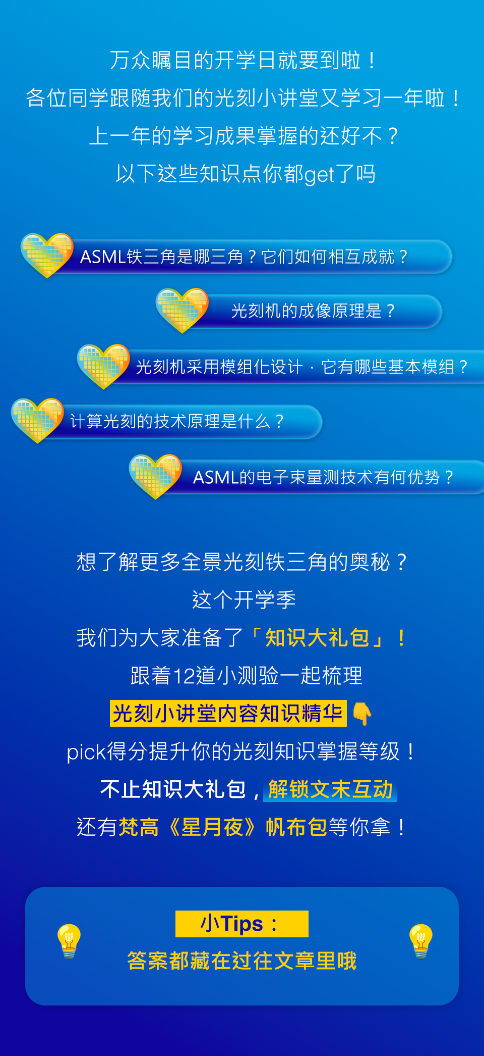 摘要:开学季在即,12道小测验带你回顾ASML光刻小讲堂全“考”点📚