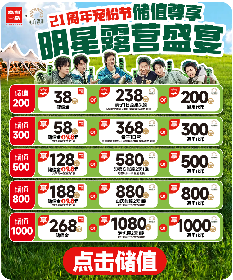 储多少,挣多少!快乐加倍!凡在嘉和一品充值任意档位,我们将立即赠送您同等价值的绿洲代币!1东方绿洲代币等值于1元人民币。这不仅仅是一次简单的充值,更是一次对未来美好时光的预存。采摘蔬果的乐趣、亲子课程、户外美拍、畅游娱乐设施的欢笑、静谧客房的休憩……一切,都将因你的这一小步而变得触手可及,且全部通用,无门槛畅享!