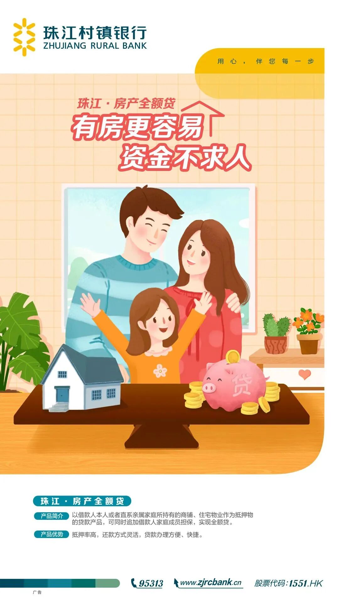 产品介绍 “珠江·房产全额贷”是珠江·一家亲产品的升级版,以借款人本人或者直系亲属家庭所持有的商铺、住宅物业作为抵押物的贷款产品,可同时追加借款人家庭成员担保,实现全额贷。 产品特色 |