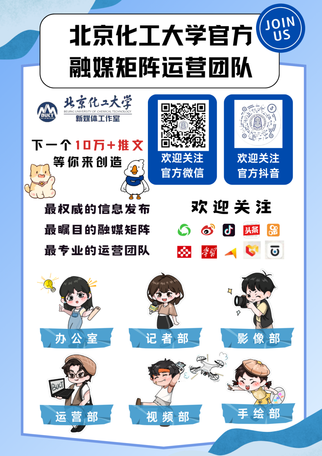 北京化工大学官方融媒矩阵运营团队,秉承“讲好北化故事,传递北化声音,汇聚北化力量”的运营使命,积极塑造健康向上的校园文化氛围,引领校园良好风尚,参与运营和建设学校官方微信公众号、官方微博、学习强国号、抖音号等学校“两微十号”融媒矩阵。