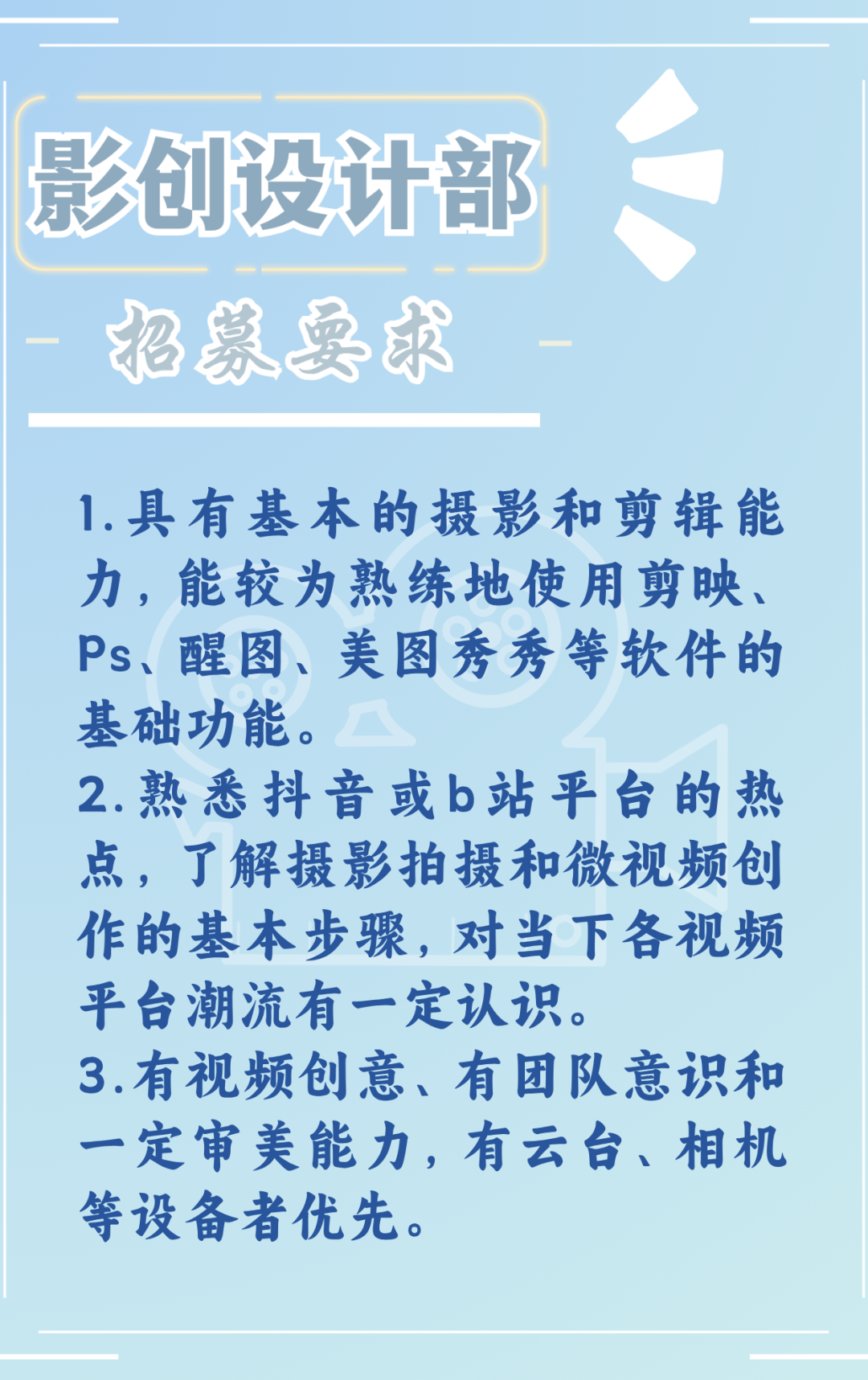 1.想参加新媒体中心体验营的同学,除了要完成你心仪的部门留下的任务,还要填写纳新报名表哦(报名表可以扫描下方二维码获取或者点击文末“阅读原文”,提取码为:sdnu)!欢迎你在正式纳新的时候加入新媒体中心大家庭!2.报名截止时间为2024年8月7日中午12:00,大家不要错过报名时间!3.报名可以填写两个志愿部门,须选择是否服从调剂。作品请发送到邮箱sdnu1950xmt@163.com。文件命名方式:姓名+第一志愿+第二志愿(例如,第一志愿为运营部,第二志愿为影创设计部,则须以“姓名+运营部+影创设计部”命名文件并发送)。如果你的一、二志愿相同,仍按照上述方式命名(例如,第一、第二志愿均为美工部,则须以“姓名+美工部+美工部”命名文件并发送)。4.各部门进行线上报名审核,审核结果将于2024年8月8日前通过短信进行通知,请及时关注。6.欢迎各位萌新加入第十一届山东师范大学党委宣传部新媒体中心新媒体体验营群聊(群号:680124688)。