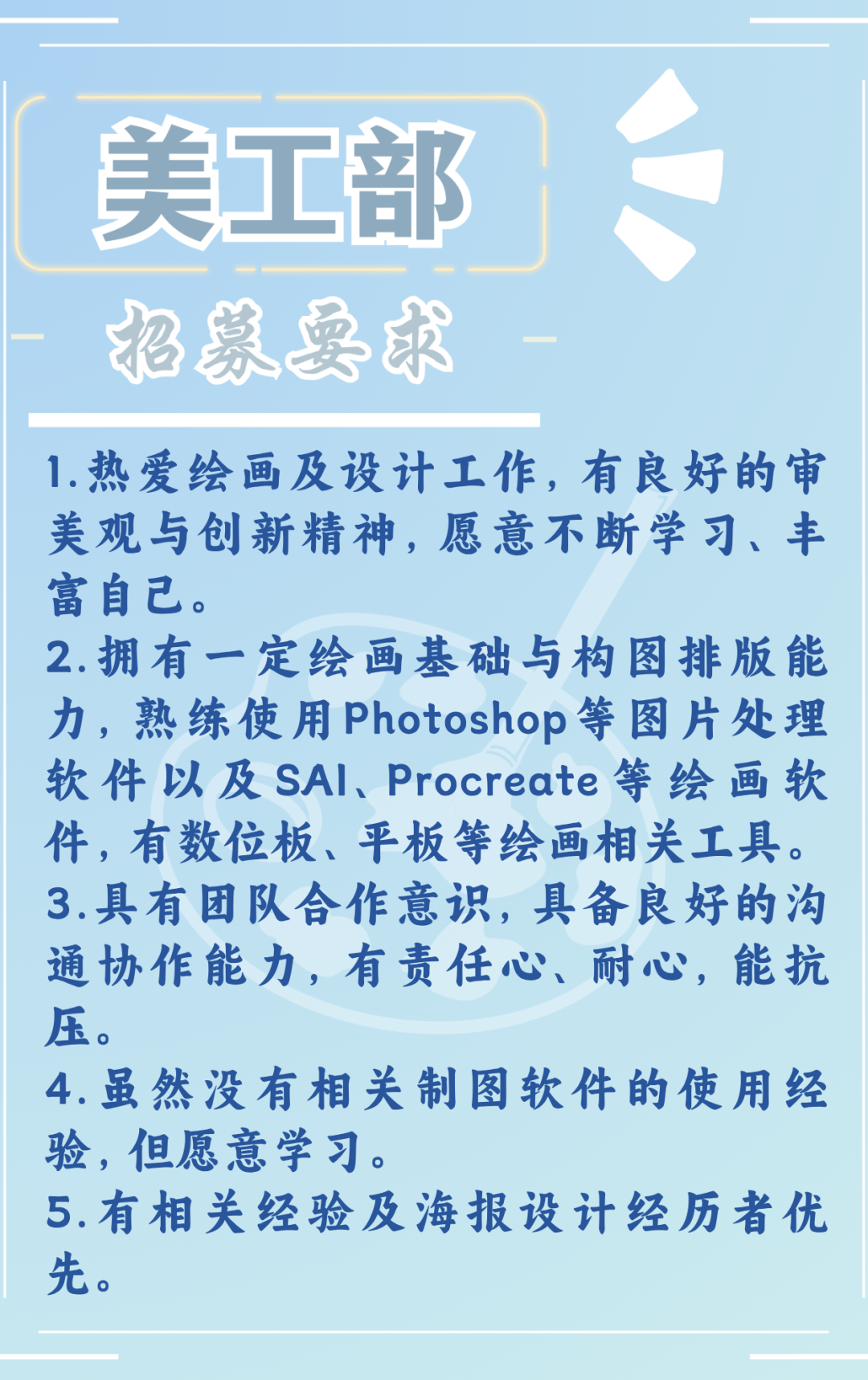 1.提交3-5张可以代表自己绘画水平或制图水平的图片,要求图片内容均为独立原创。2.另附文档:200字左右自我介绍(有无擅长的制图软件,绘画/作图时的经验心得体会)。3.请将作品以压缩包的形式,按照文末要求发送至指定邮箱。