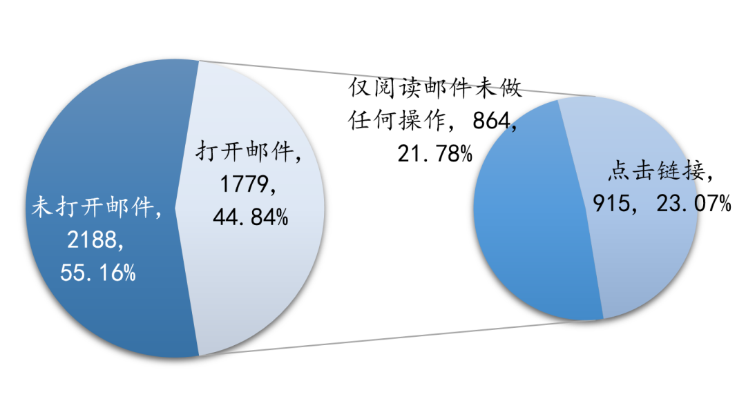从演练结果来看,我校师生具备一定的反钓鱼邮件的安全意识,但并不能完全识别钓鱼邮件,故点击钓鱼邮件中链接地址的还是占了打开邮件总人数的一半左右;但师生对于个人敏感信息的保护意识较高,最终提交敏感信息的占极少数。