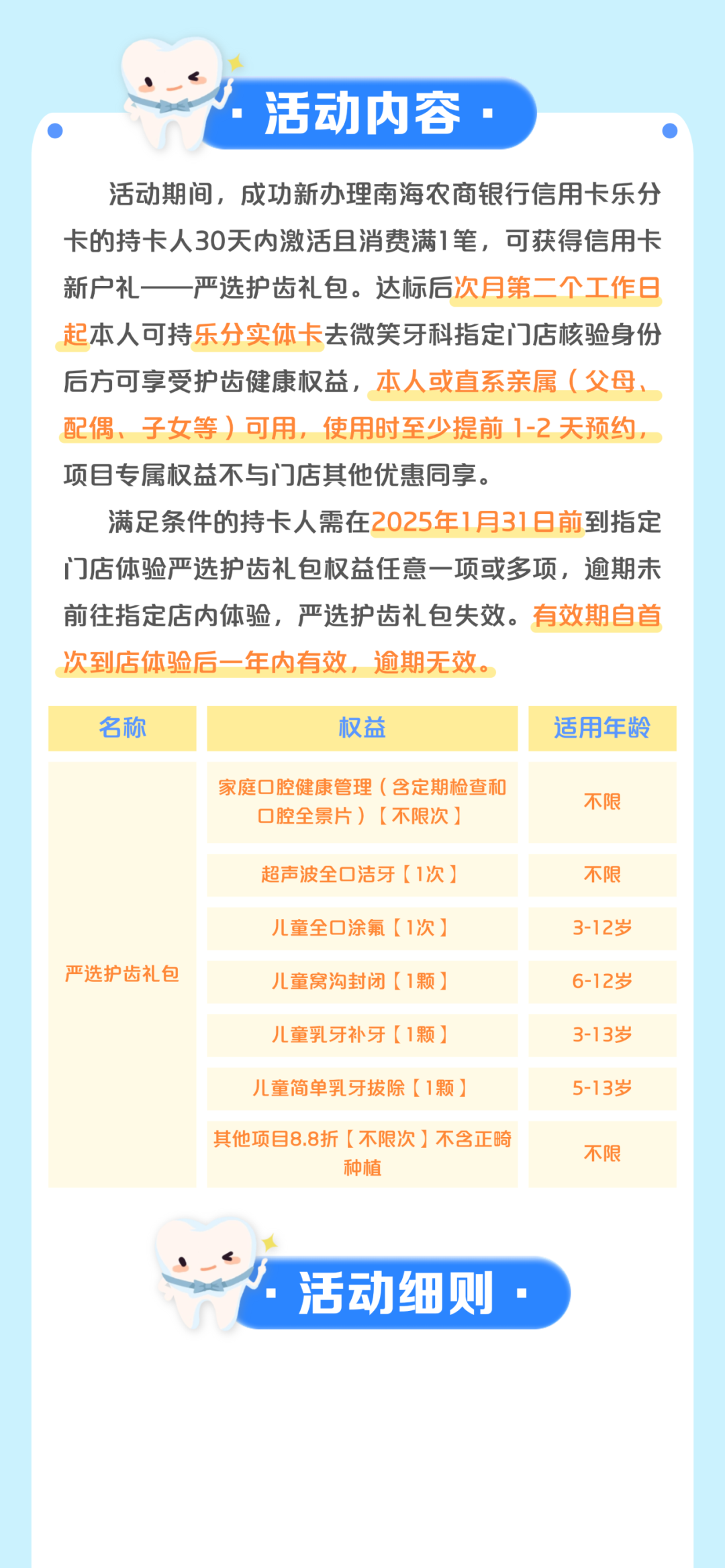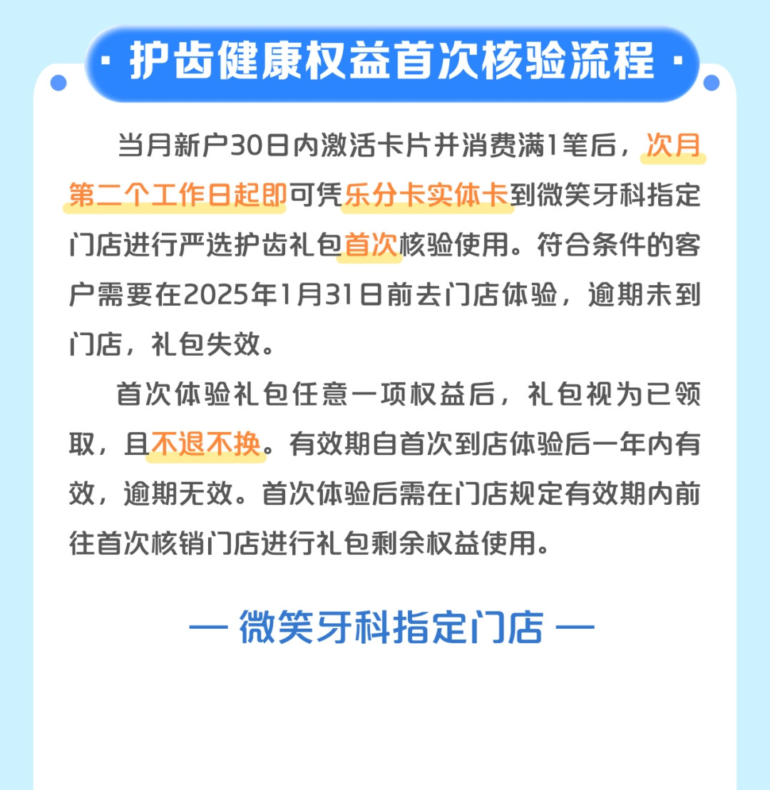 3.乐分新户开卡礼-严选护齿礼包首次到店体验的有效期为2025年1月31日。逾期未到店领取体验任一权益内容,礼包权益失效。
