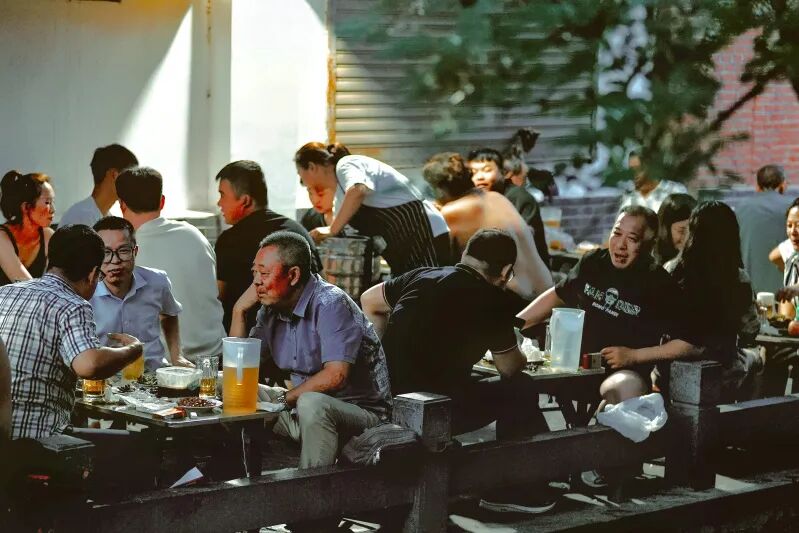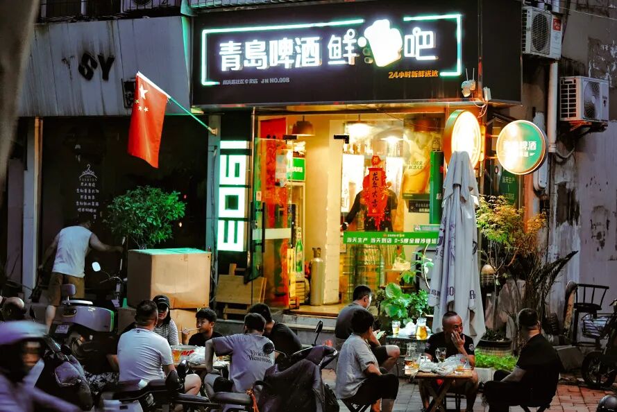 啤酒屋是独属于济南人的“bistro”,很多店顺带会做一些本地人爱吃的下酒菜,酒客也可以外带熟食菜肴等来下酒。有些甚至是“早C晚A”的经营模式,白天是卤煮和熟食店,晚上就成了啤酒屋。和鲁菜馆子相比,这里的下酒菜更像是济南人的家常口味。和老俞啤酒屋这种专注扎啤垂直赛道的老式啤酒屋相比,于家桥的“小河人家”大概是游客攻略里最有名的啤酒屋。济南地底下泉脉交错,暗渠小河 “生产渠”百泉汇流贯穿老城。从五龙潭公园穿街过巷蜿蜒北流,到了于家桥就成了明渠,和周围的民居形成了泉城独有的“小桥流水人家”的景象。不仅菜单的选择更为丰富,“小河人家”靠着泉水河流,温度也更带爽意。在泉水河畔喝杯扎啤撸个串,也成为泉城独有的一道体验。