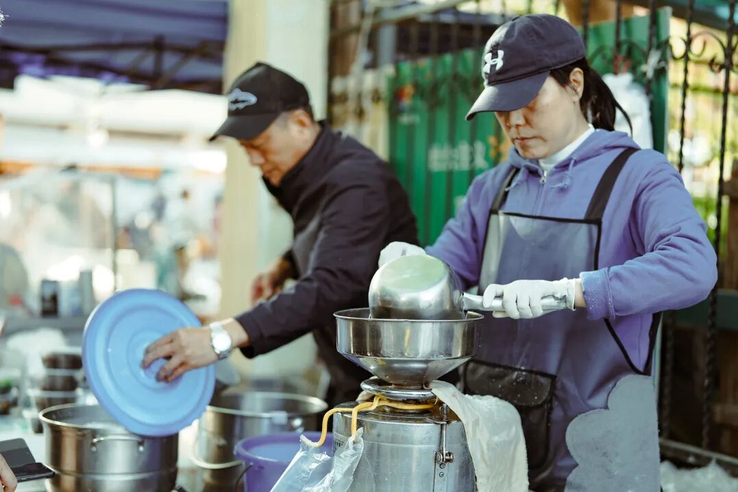 藏在社区里的早市,比各种网红美食街更能捕捉到本地人的口味。路边各式各样的小吃,经常会让人三步两回头地陷入选择障碍。作为碳水大省山东的省会,就算是夏天,也少不了一口热气腾腾的面食。想吃什么,闻着香味儿就能找到摊位。甜沫儿就糖果子,商河老豆腐脑配油条,甚至是豆腐脑和胡辣汤的两掺,都是济南人钟爱的早餐经典搭配。久违的老式豆浆机,一边出豆渣,一边出豆浆。现磨现煮的黑豆鲜豆浆,灌入塑料袋里,插个吸管提着就可以喝。在济南,很多早市经营多年,随便一家老式豆腐脑,本地人都可能会告诉你,“那是我从小吃到大的味道。”