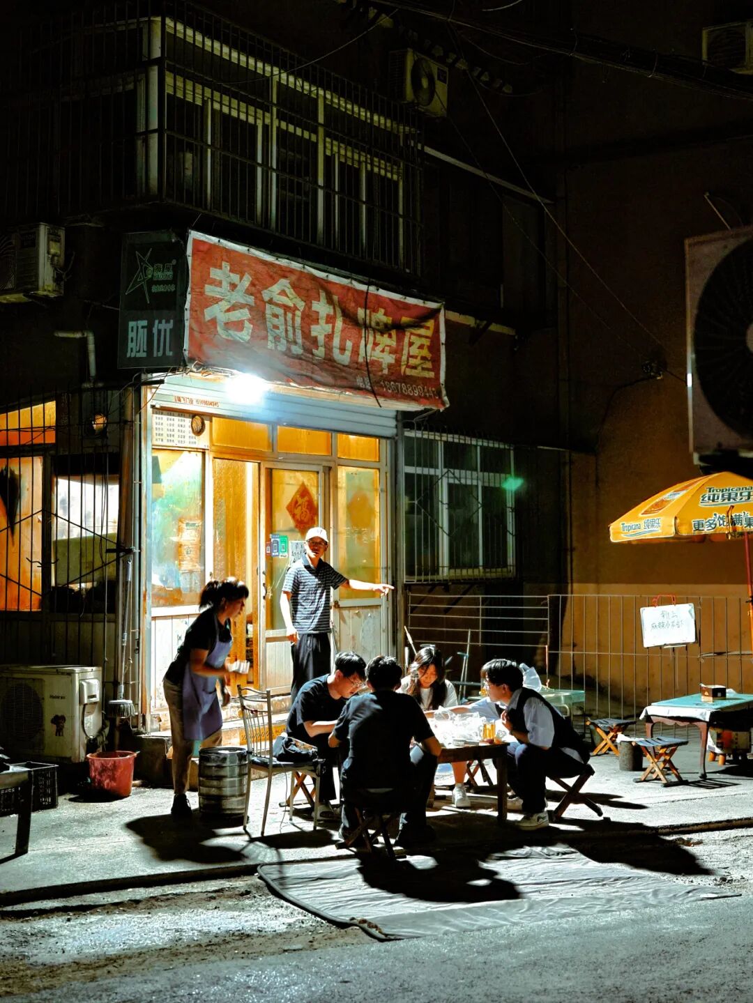 去哪家扎啤屋喝?肯定是自家小区楼下。铜元局前街里藏着交错的小巷,弯弯绕绕可以走进老小区里,一楼的门头房里经常会延伸出来几家扎啤屋。四脚桌,小马扎,扎啤罐,“松弛感”在这里肆意疯长。 “一杯扎啤,一把白条,一盘花毛一体,一盘嘎啦油子”,是地道济南人的点餐术语。