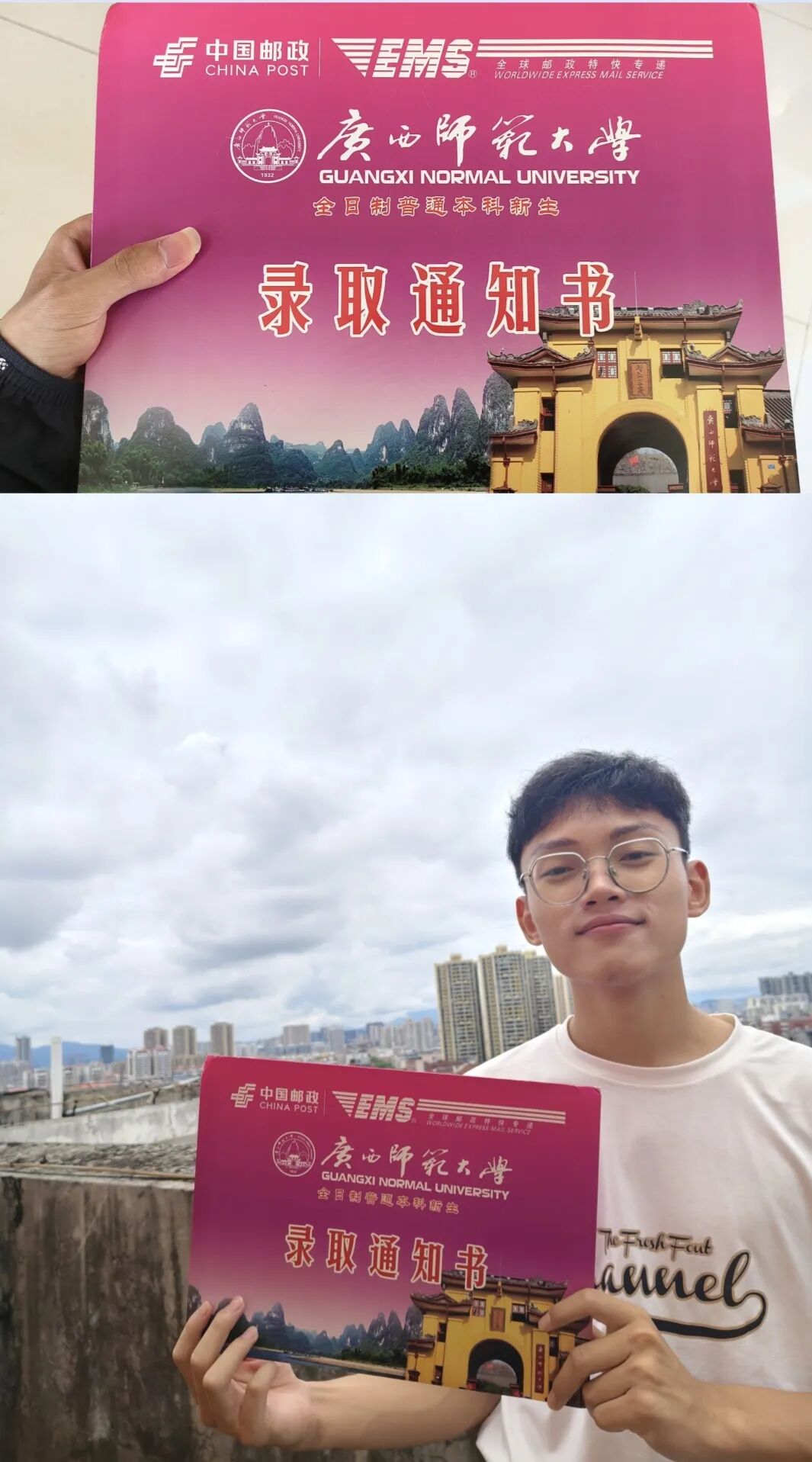 跨越1722公里,广西师范大学的录取通知书来到了山东,来到了我的手中。手捧这封录取通知书,我难掩心中的激动。无他,走过寒窗数十载,终得以自豪地站在你面前——广西师范大学。