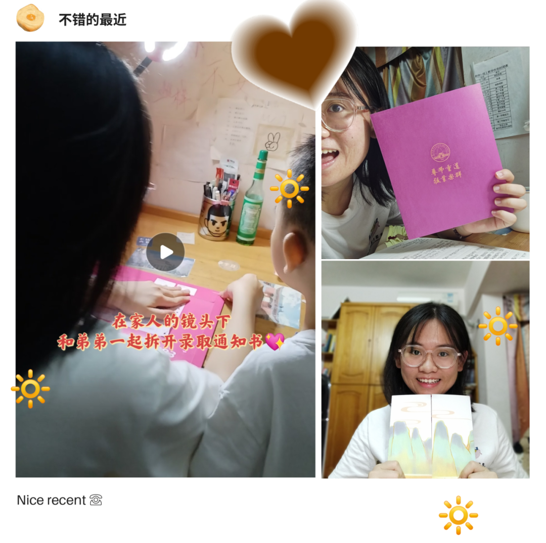 清楚的记得是下雨天,我收到了广西师大的录取通知书。特意向快递员叔叔借了防水袋,怕回家的路上把它弄湿,紧紧地捧着它。这份喜悦终是在全家人的见证下打开。轻轻打开,我看到了通知书后面的校训“尊师重道 敬业乐群”。我想,这是我未来要一直坚持的事。未来想成为一名语文老师的我,终于向自己的梦想又迈进了一步。相信命运与缘分,在广西桂林这座城市,我希望能拼搏出一个新的自己,体验热气腾腾的生活,希望能珍藏到不朽的记忆……广西师大,我来啦!😊