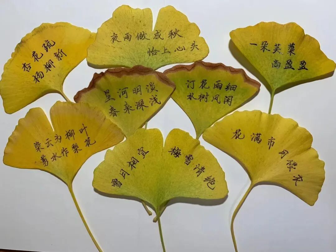 老师还在银杏叶上写了自己的诗作